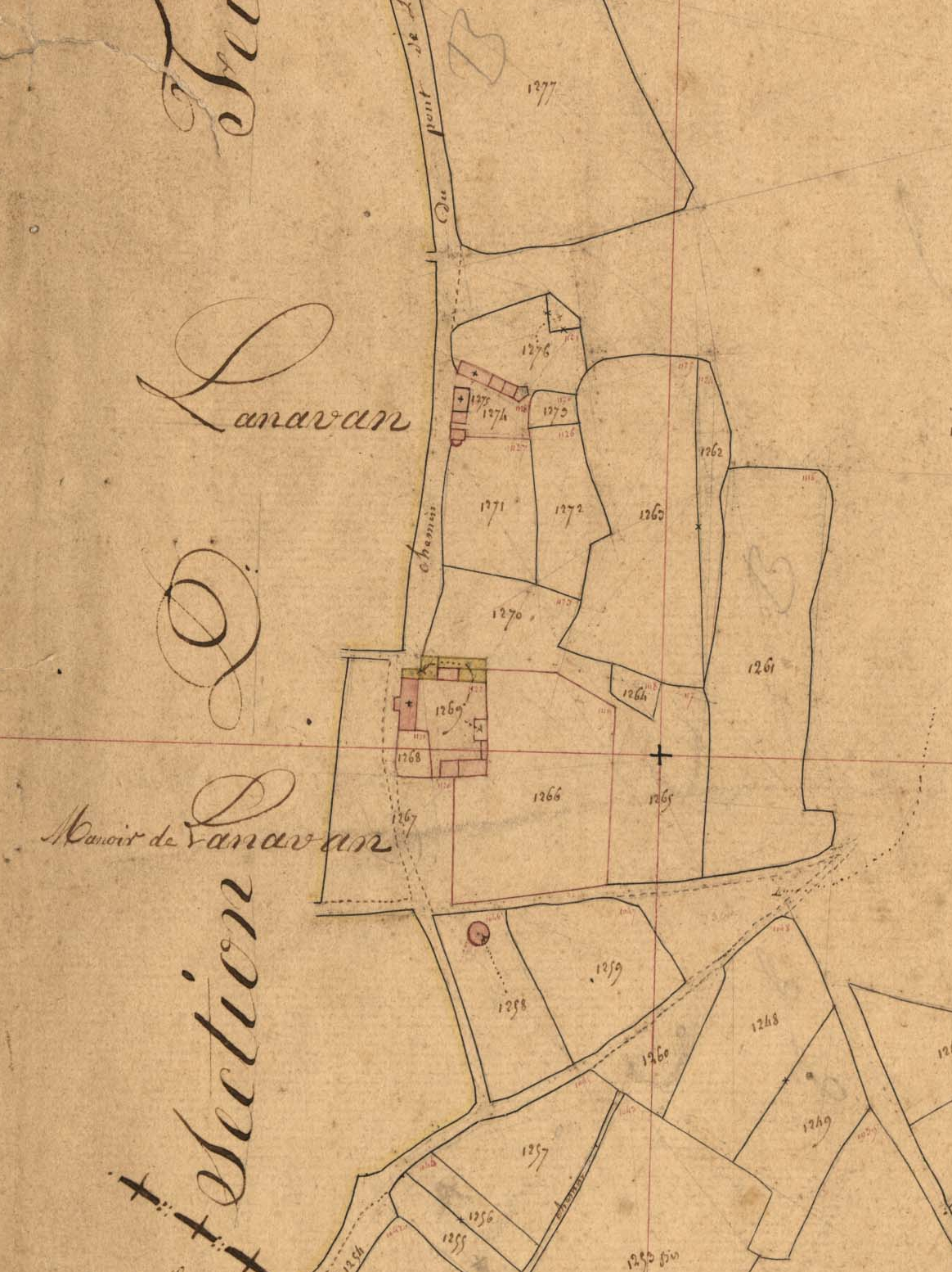 Village de Lanavan côté est et manoir. Section D 2 de Kervitam du cadastre ancien de la commune de Mahalon, 1836.Immatriculation
