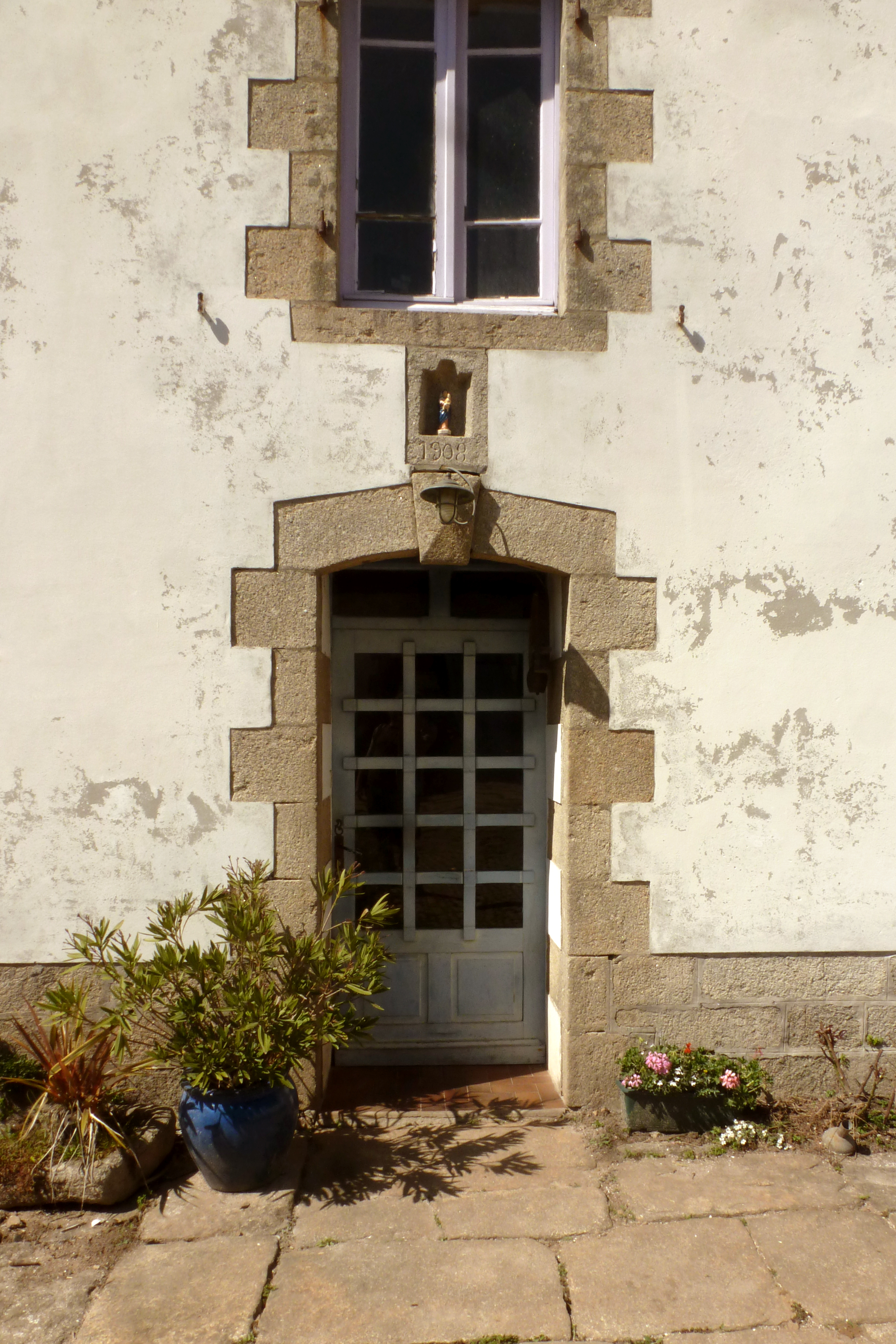 Logis daté 1908, détail de la porte d'entrée et niche à saint. (2021)Immatriculation