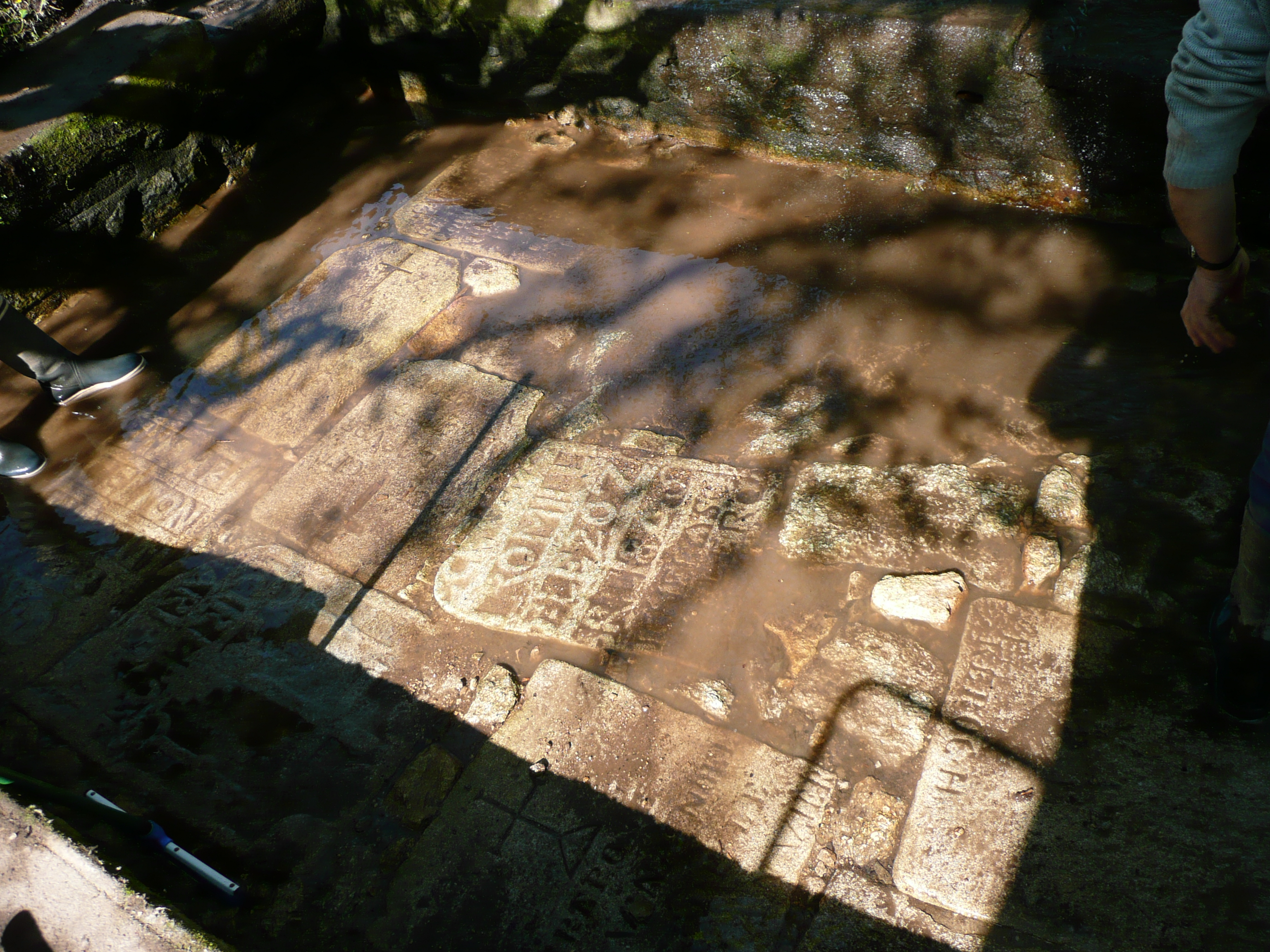 Détail du dallage en pierres tombales réemployées. (2017)Immatriculation