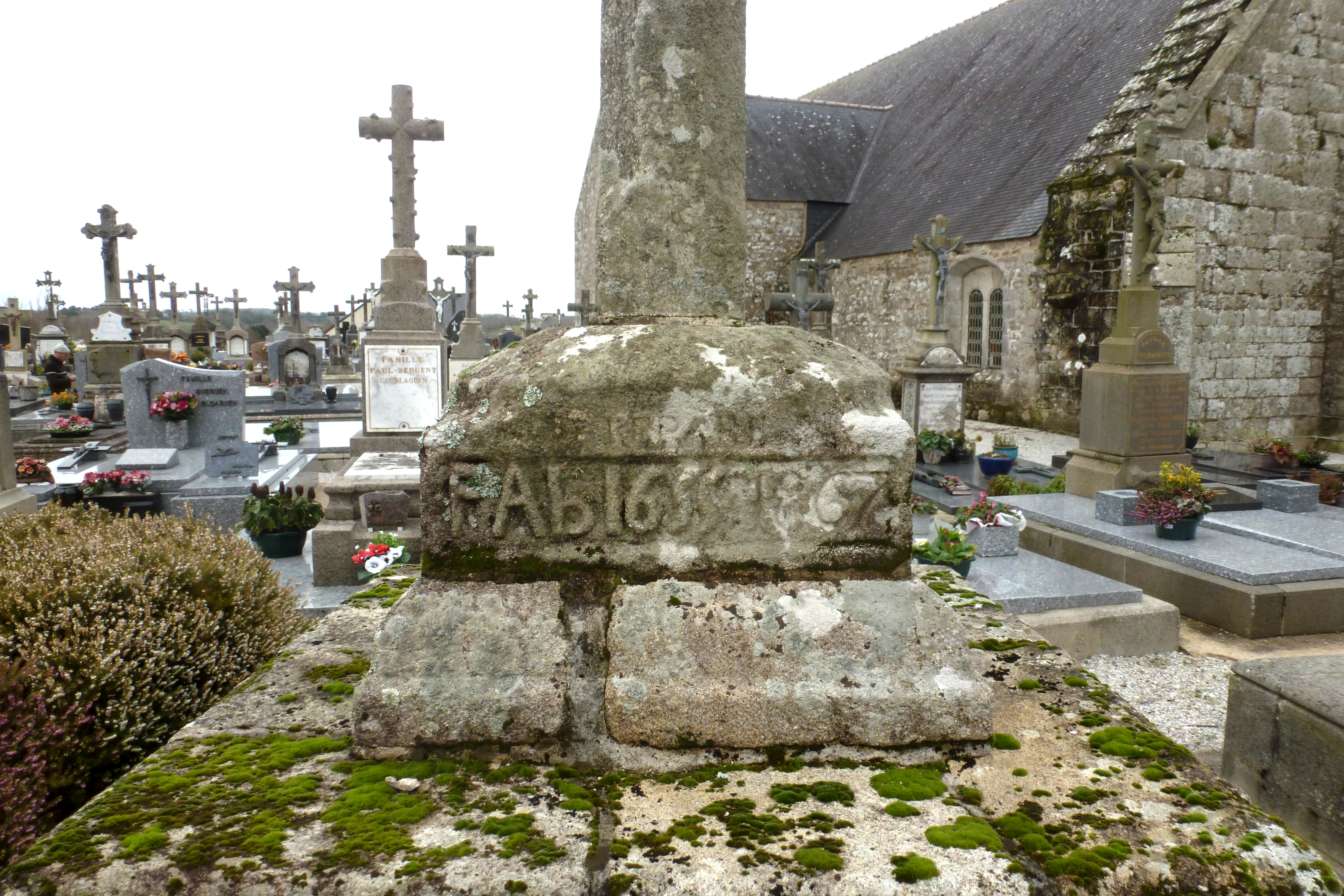 Croix du cimetière de Meilars, détail du socle côté ouest et partie de l'inscription : MOALIC FAB 1655 REPARE EN 1867.Immatriculation