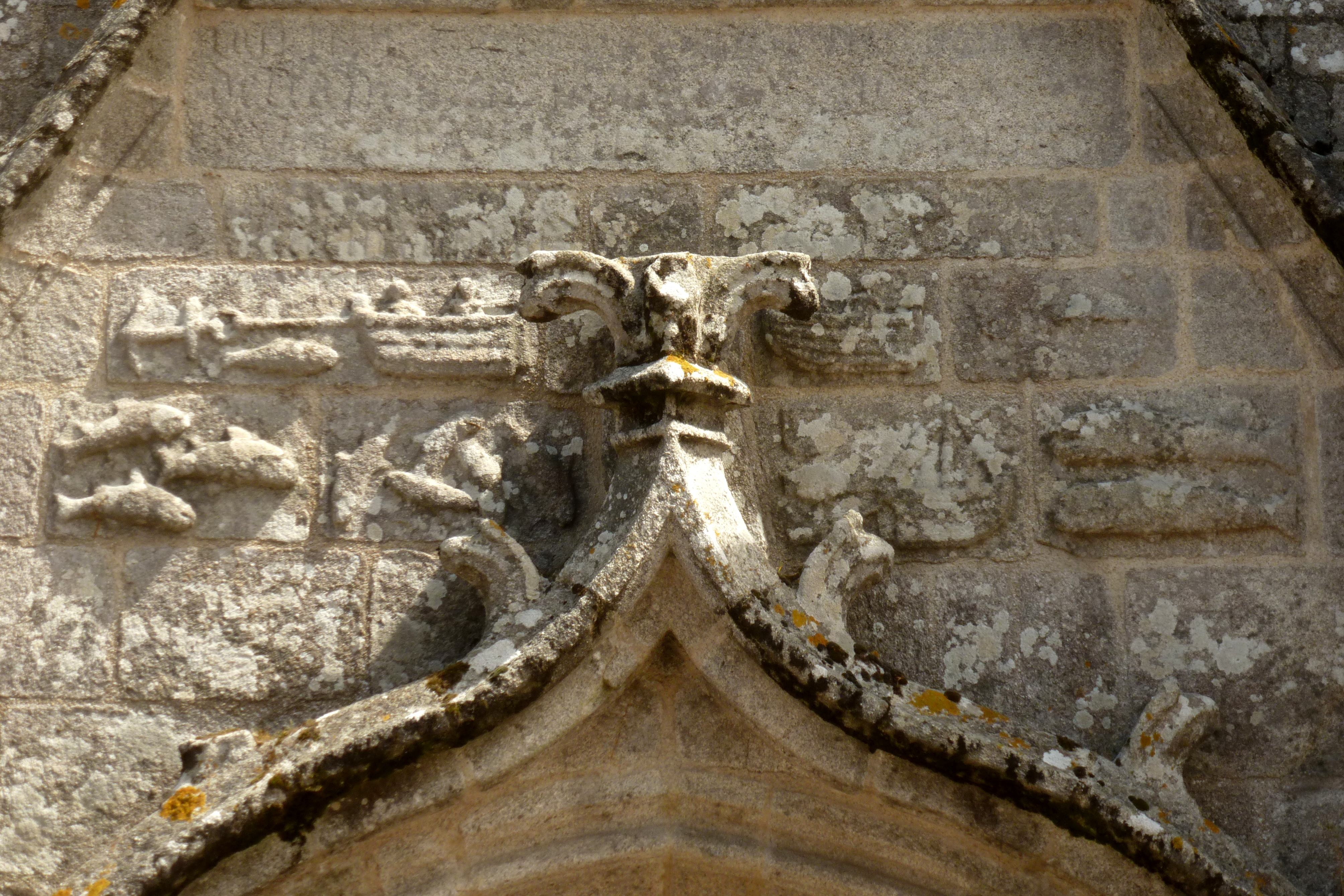 Porche ouest, détail des hauts reliefs et date MILVCXXVIII (1528). (2021)Immatriculation