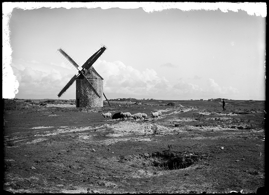Moulin du Custrein (?) entre 1908 et 1912. Reproduction plaque de verre.Immatriculation