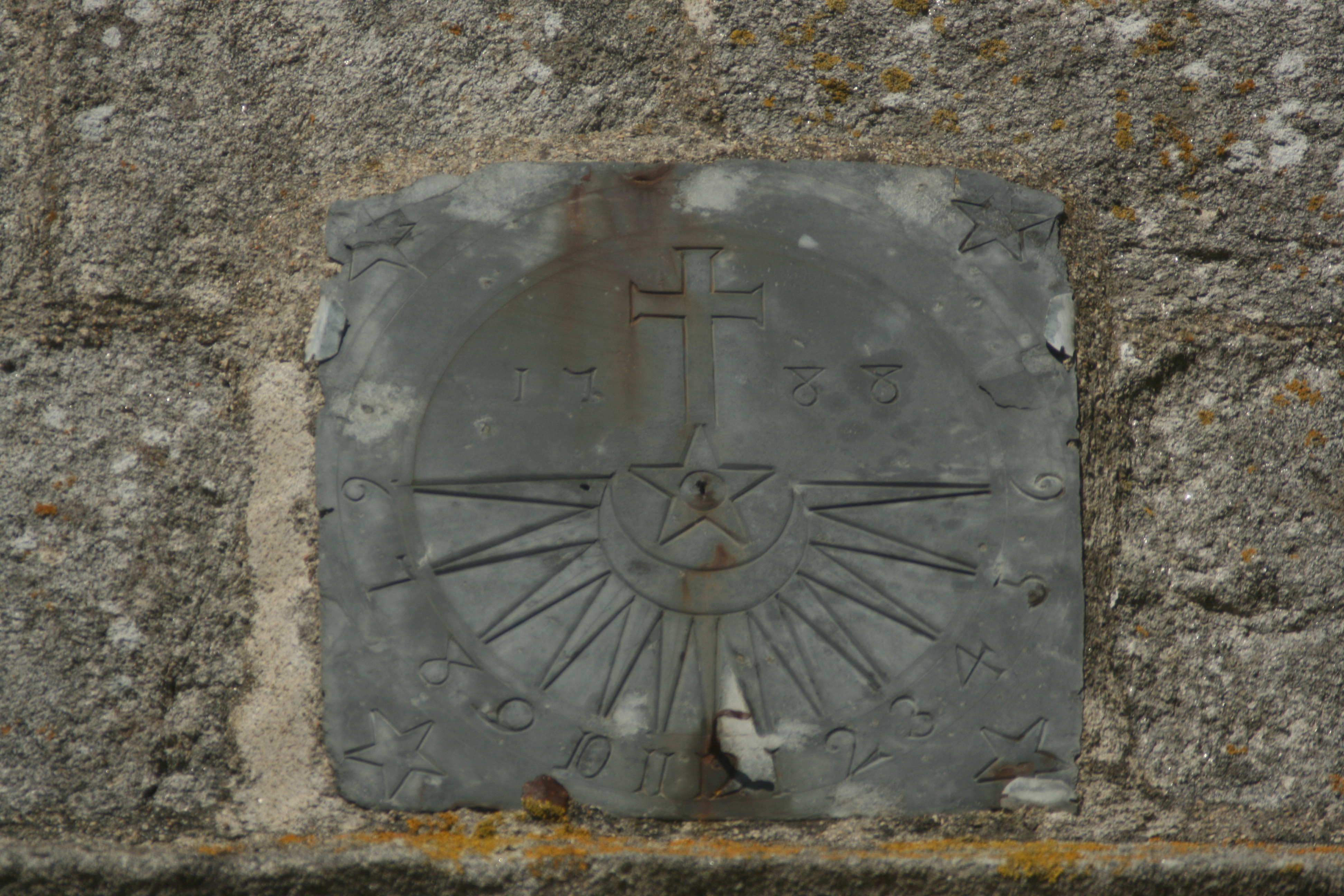 Confort-Meilars, église paroissiale Notre-Dame de Confort. Cadran solaire daté 1788 placé sur le côté sud du clocher. (2021)Immatriculation
