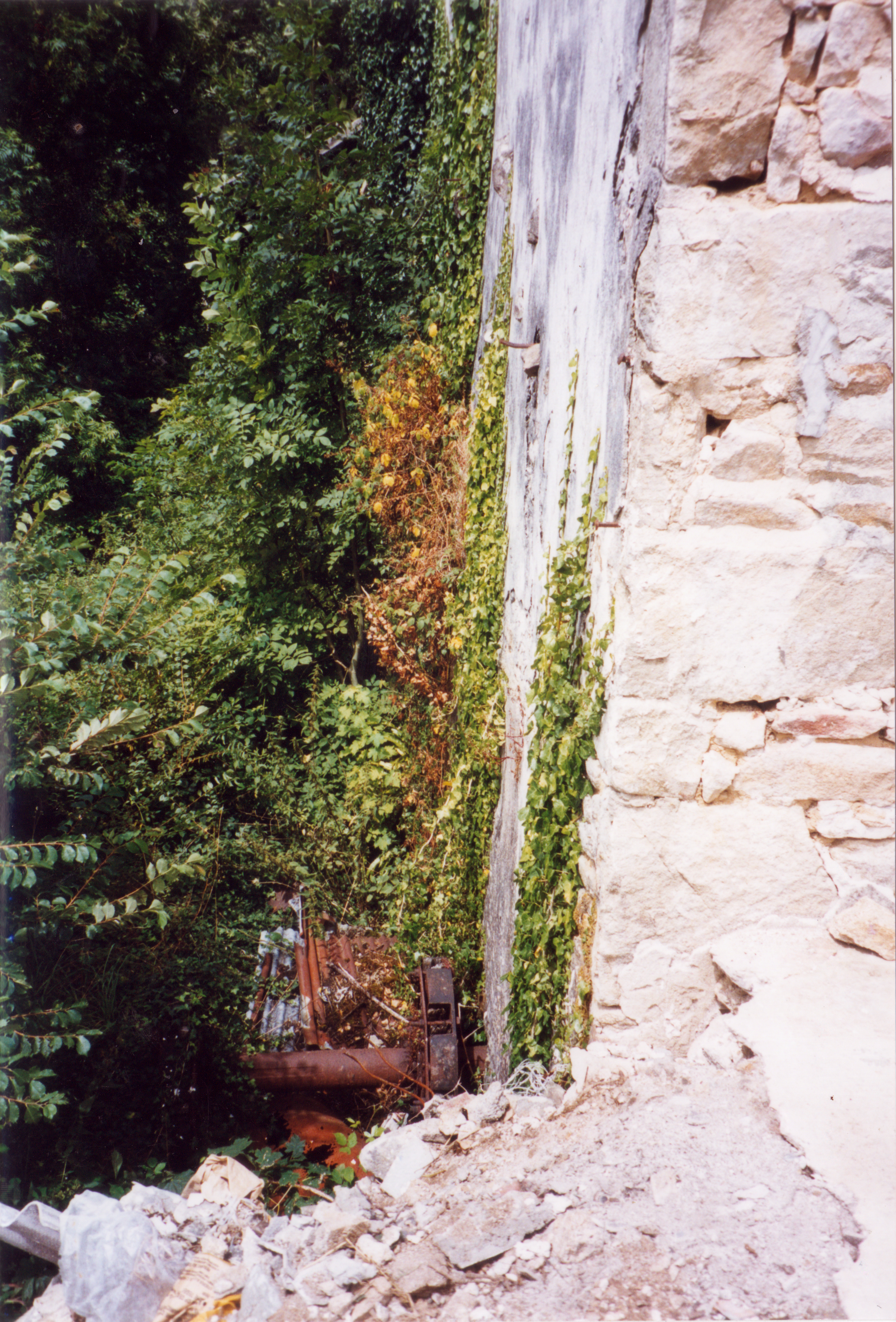 Moulin à eau de meil Kerhuon, pignon sud, vestiges de la roue verticale. (2000)Immatriculation