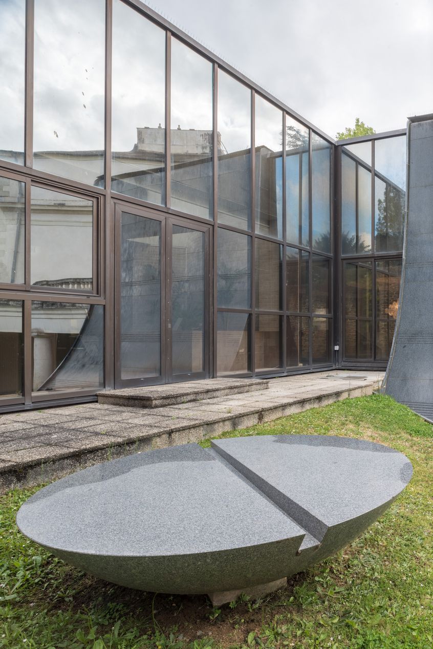 Sculpture de Marta Pan, 1985, et reflet du "mur d'eau" dans la verrière. Vue prise du sud-ouest.Immatriculation