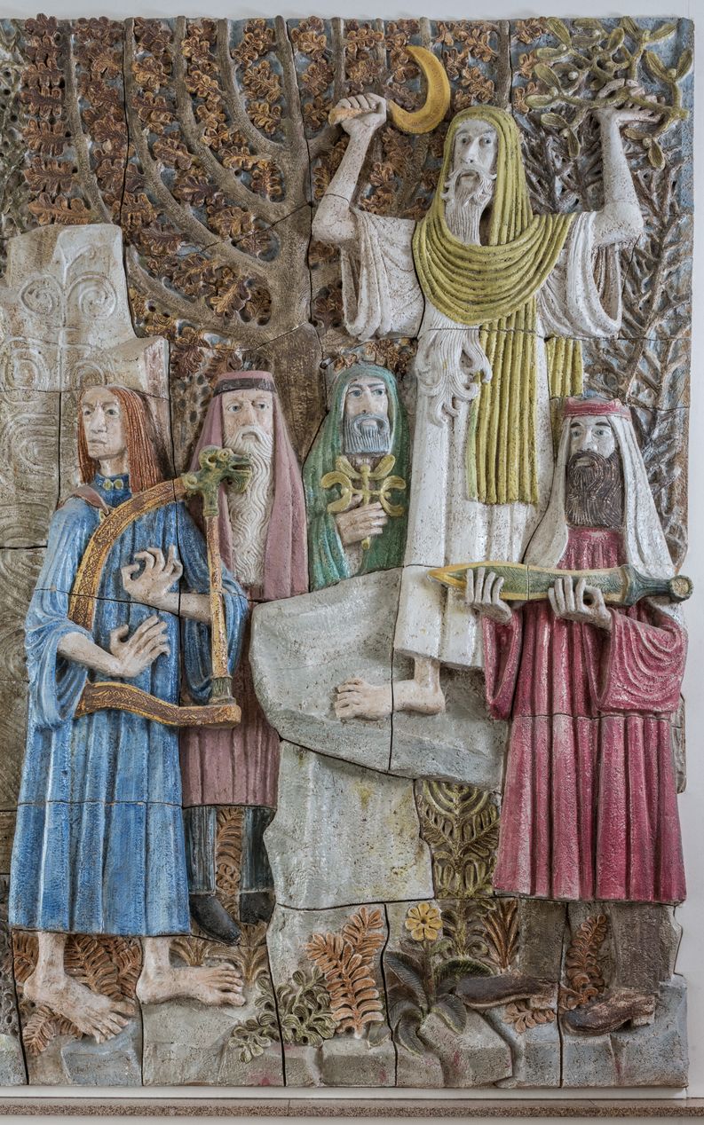"Argoat", bas-relief en céramique de Quimper de Pierre Toulhoat, 1971 : détail sur le druide cueillant le gui à l'aide de sa faucille en or, assisté de ses assesseurs.Immatriculation