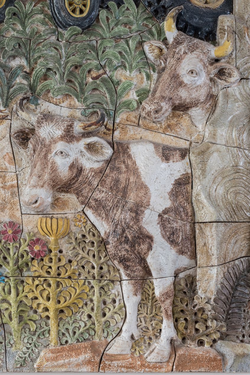 "Argoat", bas-relief en céramique de Quimper de Pierre Toulhoat, 1971 : détail sur deux vaches ou bœufs.Immatriculation
