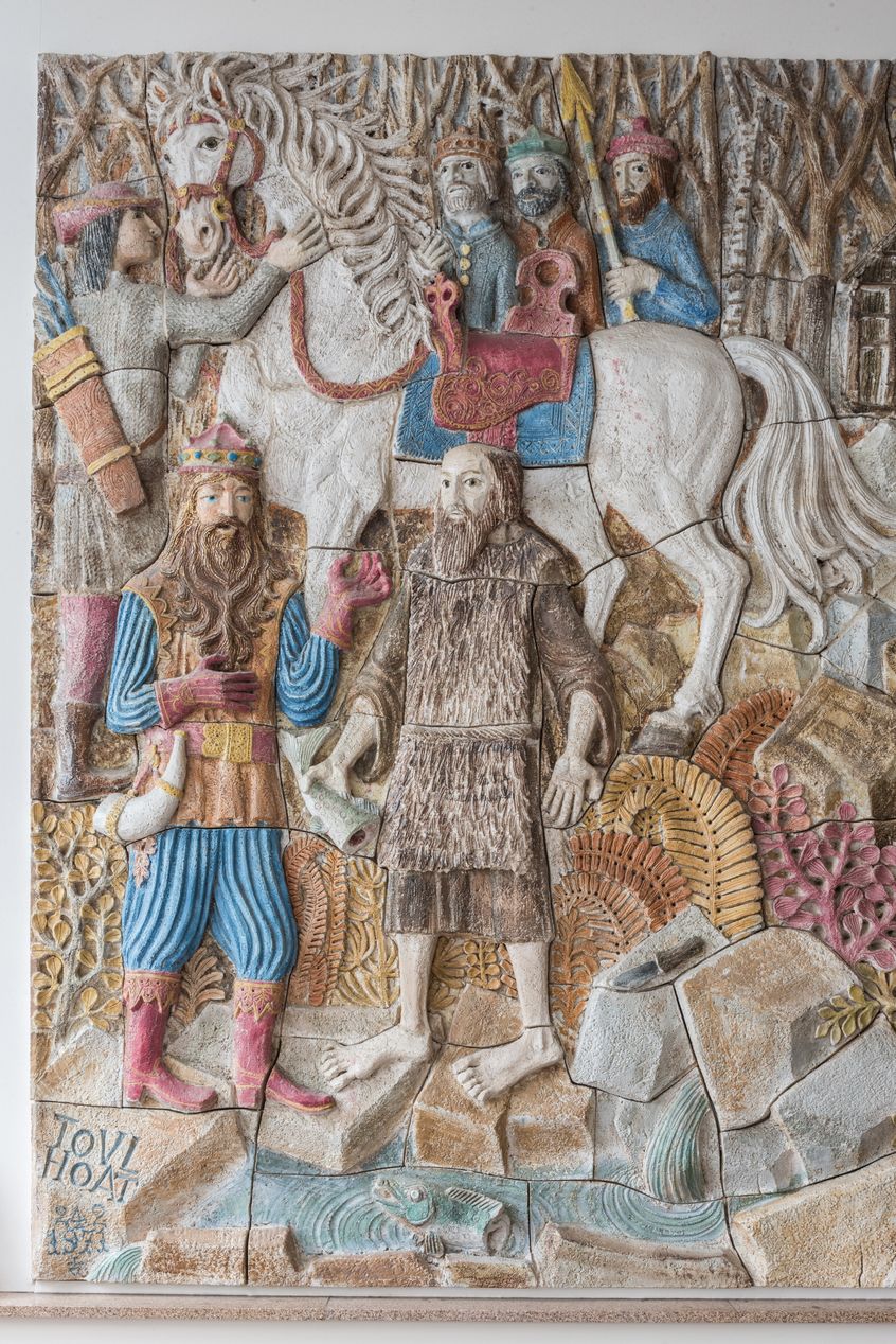 "Argoat", bas-relief en céramique de Quimper de Pierre Toulhoat, 1971 : détail sur la chasse mythique du roi Gradlon et le poisson partagé avec l'ermite Corentin.Immatriculation