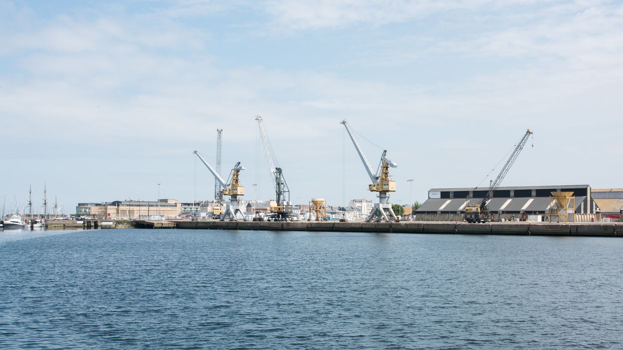 Vue générale du Bassin Vauban à Saint-Malo : sur le Quai des Corsaires, grues servant au débarquement/embarquement des marchandises. A l'arrière-plan à gauche, le palais du Grand large, centre des congrès de Saint-Malo des congrèsImmatriculation