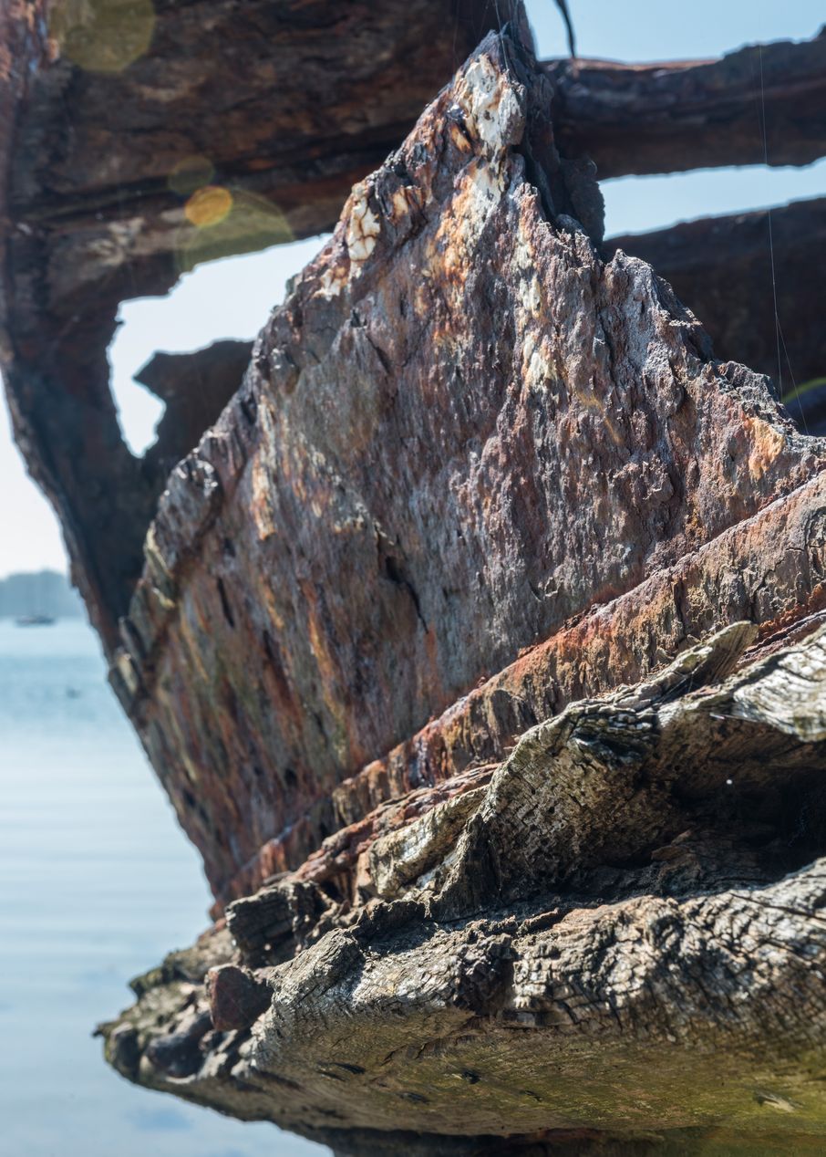 Ancien bateau des Vedettes blanches, vue de détail du bordé, mixité métal et boisImmatriculation