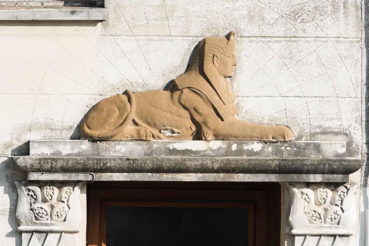 Détail sur le décor en relief : le sphinx.Immatriculation