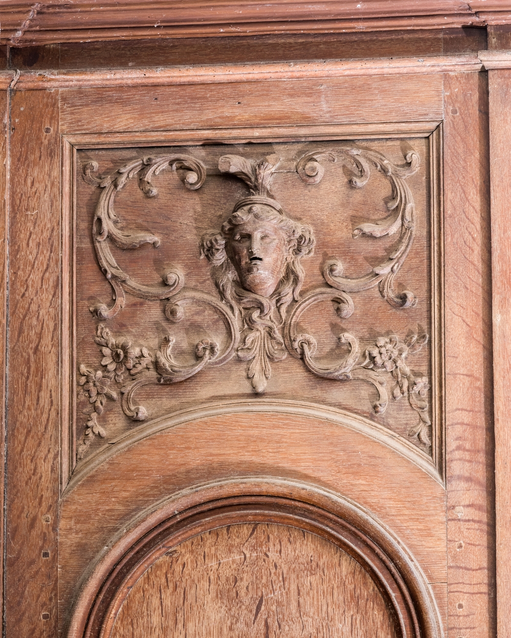 Salle à manger, détail, boiserie de chêne naturel, rinceaux et masque, dans l'esprit de BérainImmatriculation