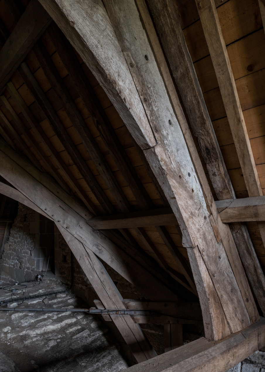 Vue de détail : à gauche, partie inférieure de l'arbalétrier d'une ferme à la croisée du transept; à droite : arbalétrier du croisillon nord du transept.Immatriculation