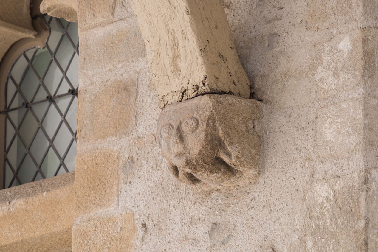 Visage sculpté sur la façade nord-ouest sur lequel repose une console de l’encorbellementImmatriculation