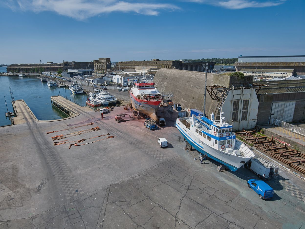 Vue de situation depuis le sommet de l'élévateur à bateaux de l'aire de réparation navale. Sur le terre-plein, des chalutiers en maintenance. A droite, le quai. A l'arrière-plan, les bunkers de KeromanImmatriculation