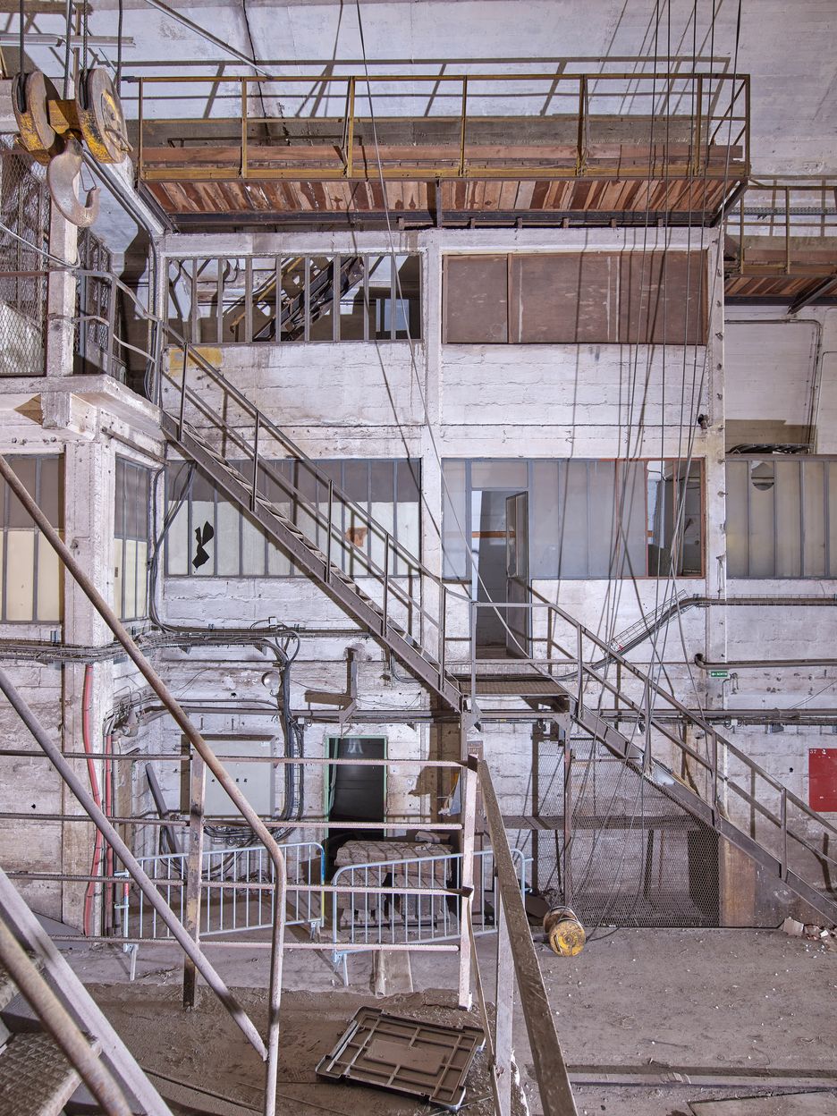 Vue des ateliers et bureaux ouest de la nef. Les niveaux supérieurs sont accessibles par des escaliers extérieurs droits.Immatriculation
