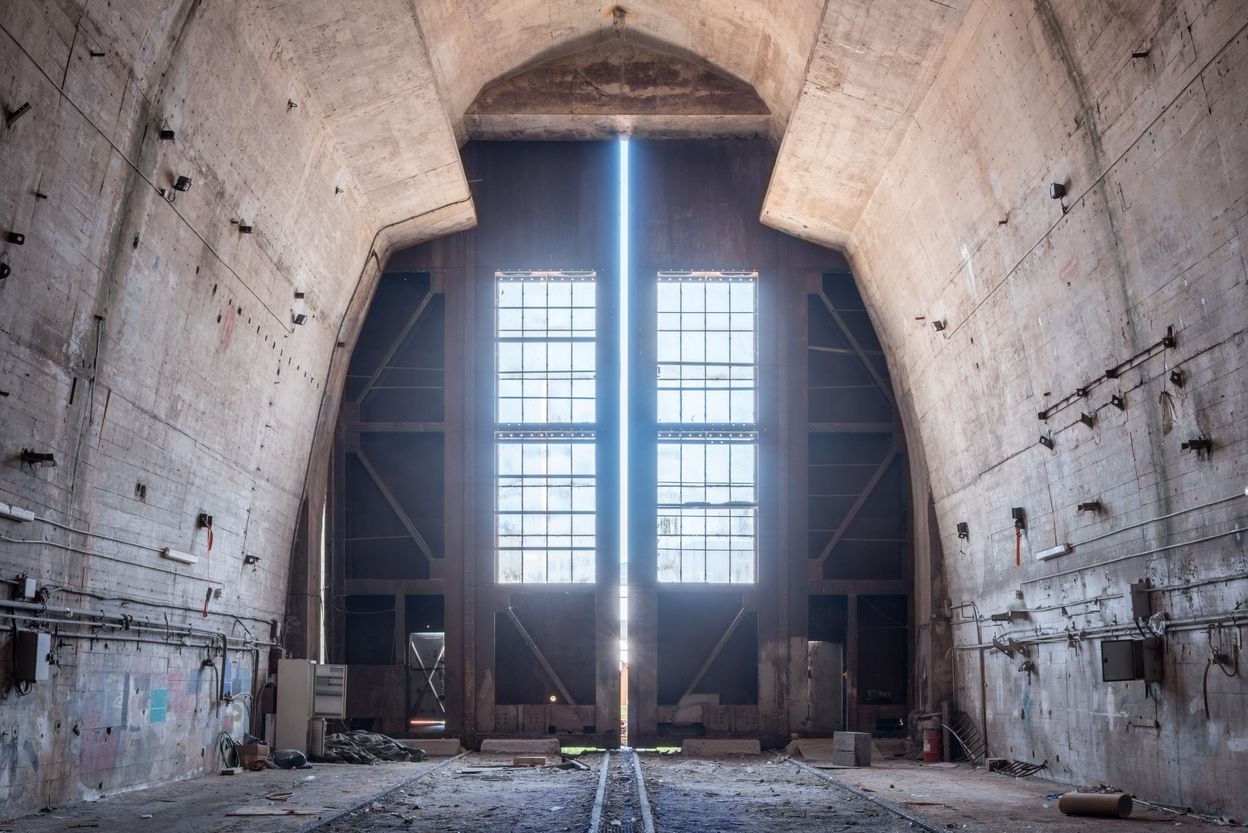 Vue axiale de la nef vers le nord. Au sol, les quatre rails spéciaux du berImmatriculation