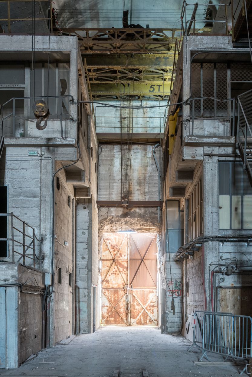 Vue axiale de la nef vers le sud : de part et d'autre de la grande porte au centre, les ateliers et bureaux. Au niveau supérieur, le pont roulant d'une capacité de 5 tonnes équipé de son treuilImmatriculation