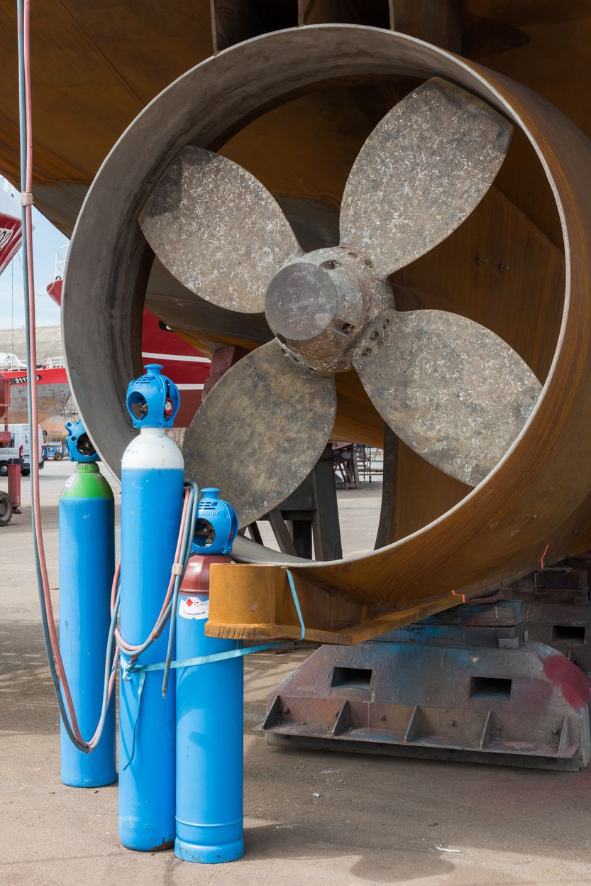 Vue de détail d'un bateau en carénage sur le terre-plein : hélice quadripaleImmatriculation