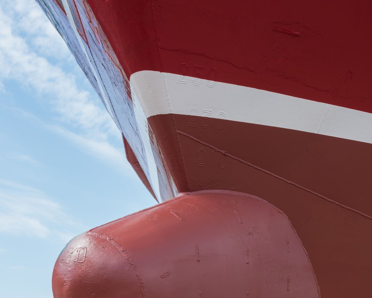 Vue de détail d'un bateau en carénage sur le terre-plein : bulbeImmatriculation