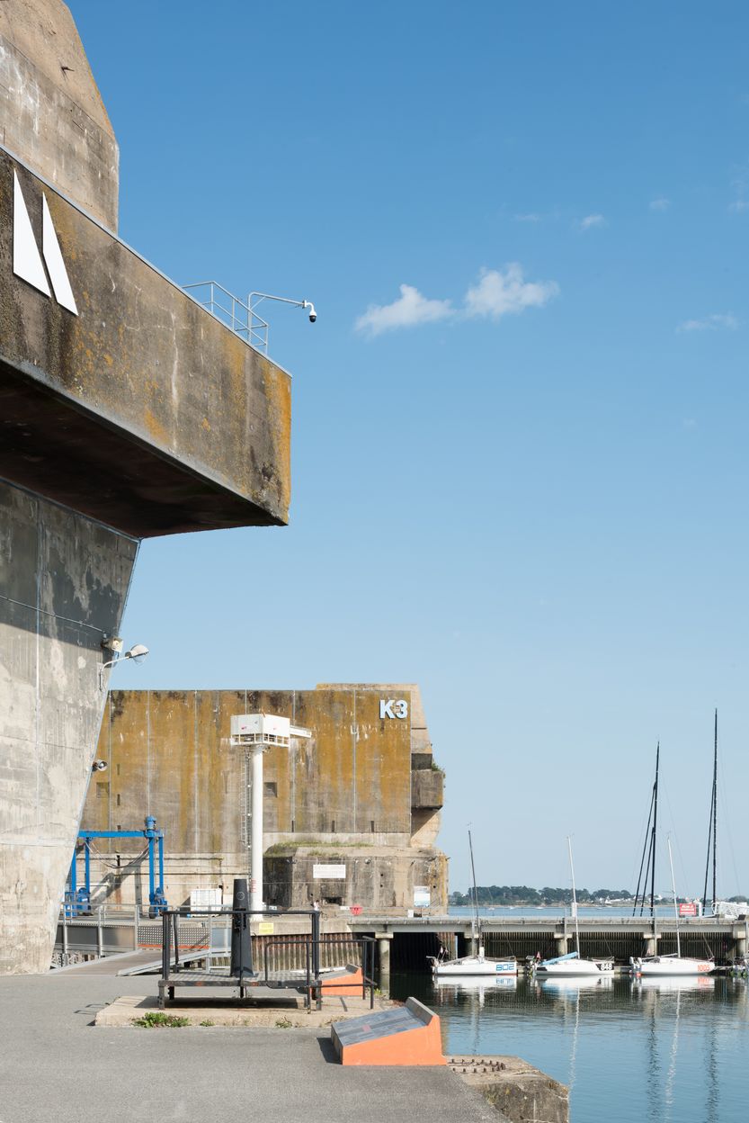 Vue de l'angle ouest du bunker "KIII' et des pontons pour navires de course au large. Au premier plan à gauche, le bunker "KI" avec l'entrée du slipwayImmatriculation