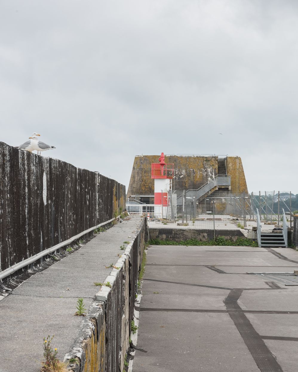 Vue de l'un des bunkers destinés à la défense antiaérienne regroupant encuvement et abri pour les soldats. Au premier plan à gauche, poutres longitudinales des chambres d'explosion (inachevées). A signaler : dispositif de signalisation maritime babordImmatriculation