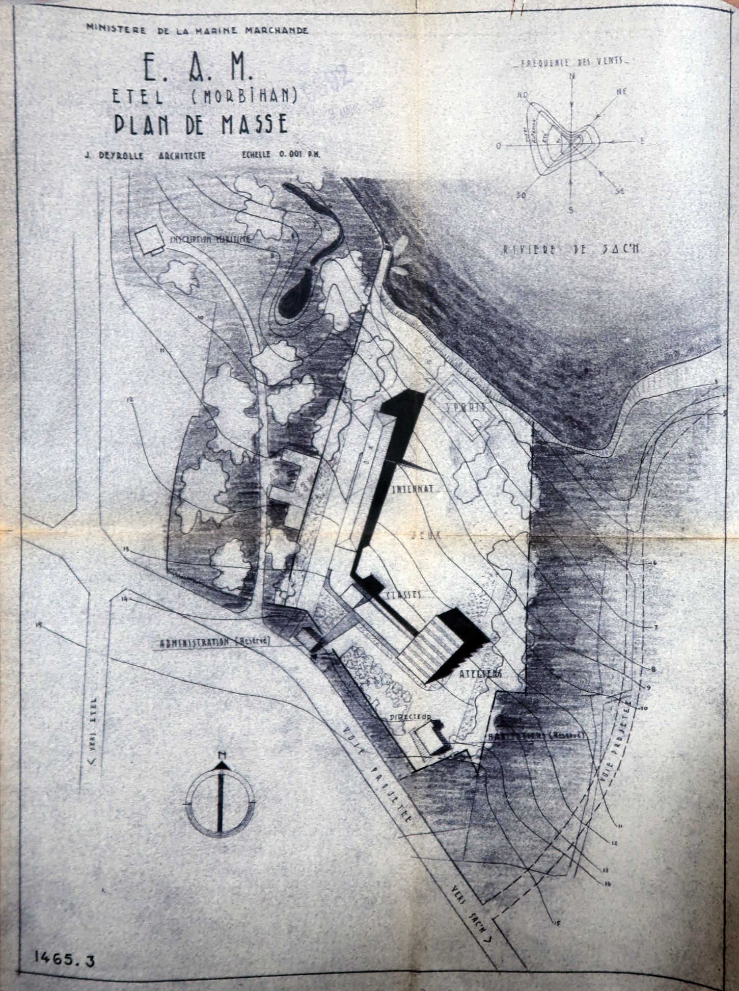 Plans de masse l'E.A.M. (école d'apprentissage maritime) - Etel. Jacques Deyrolle, architecte, sd. Plan de masse correspondant aux plans des bâtiments datés du 23 mai 1952.Immatriculation