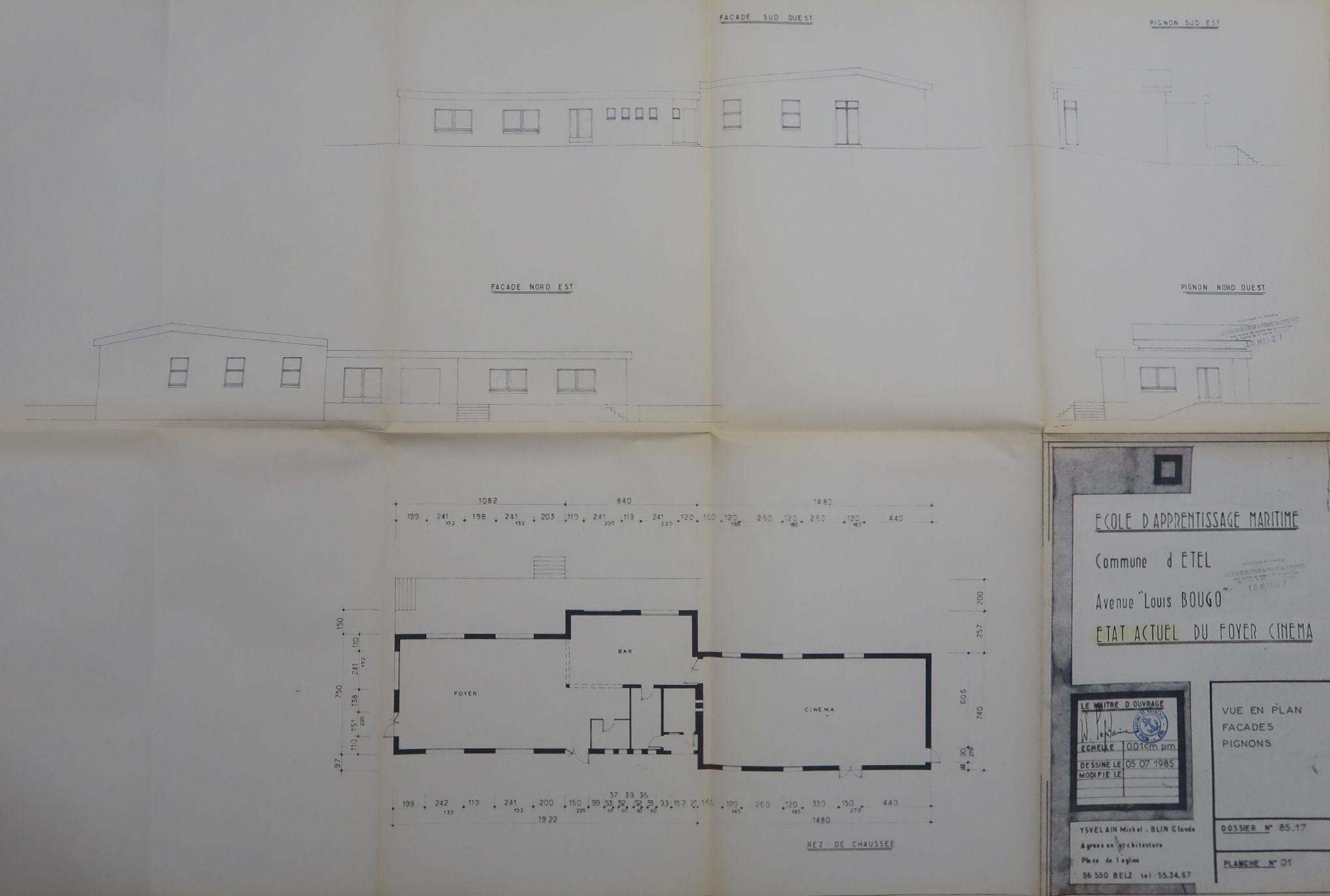Plan, façades et pignon du "foyer-cinéma", état actuel. 1985. Relevé et plan réalisés par Michel Ysvelain et et Claude Blin, architectes, en lien avec la construction du CDI.Immatriculation