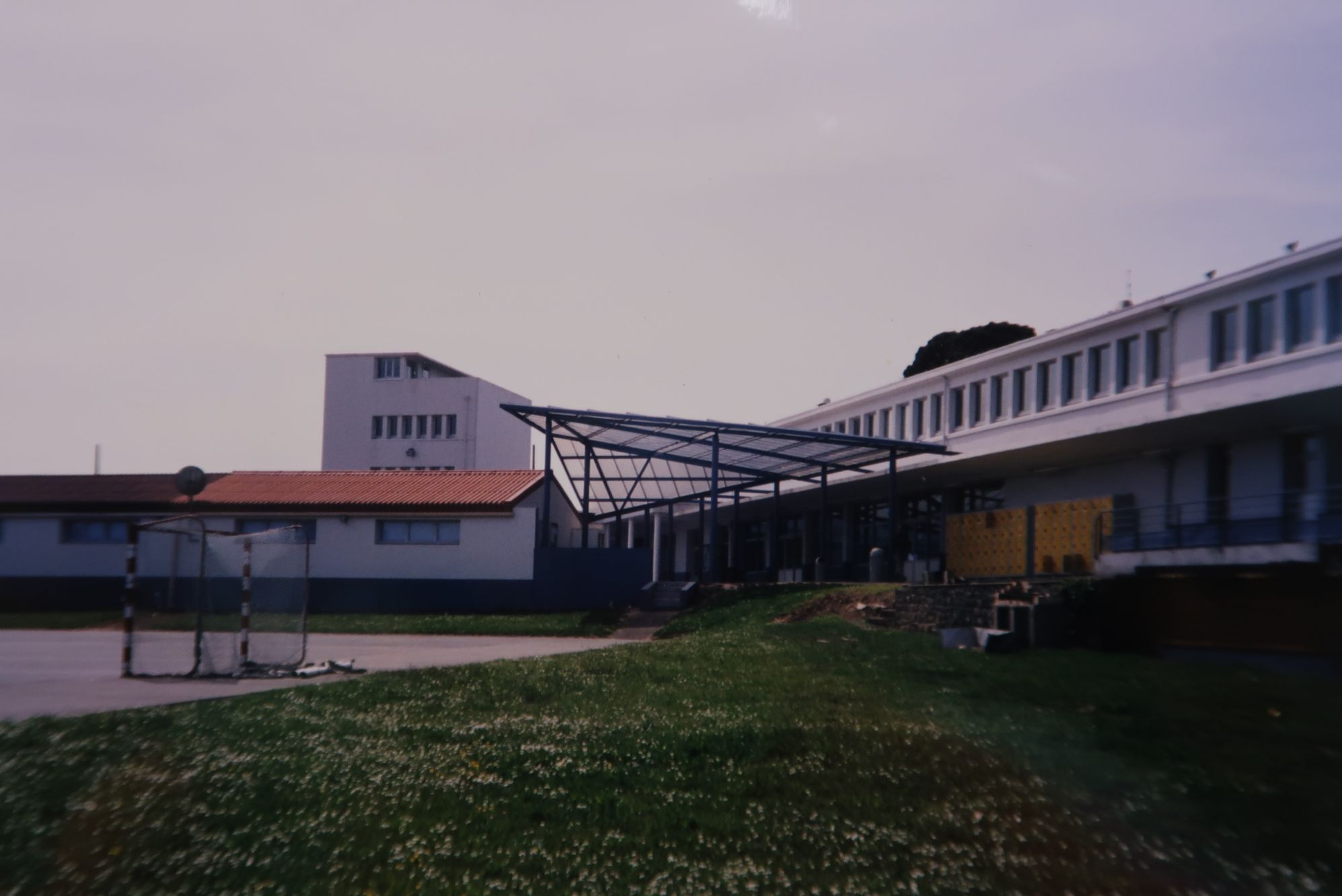 Vue d'ensemble prise du nord, après les travaux de restructuration de 1998-1999. L'agrandissement du bâtiment du CDI et du foyer, est visible à la couleur vive de la toiture, ainsi que le nouveau préau, qui relie ce dernier à l'internat.Immatriculation