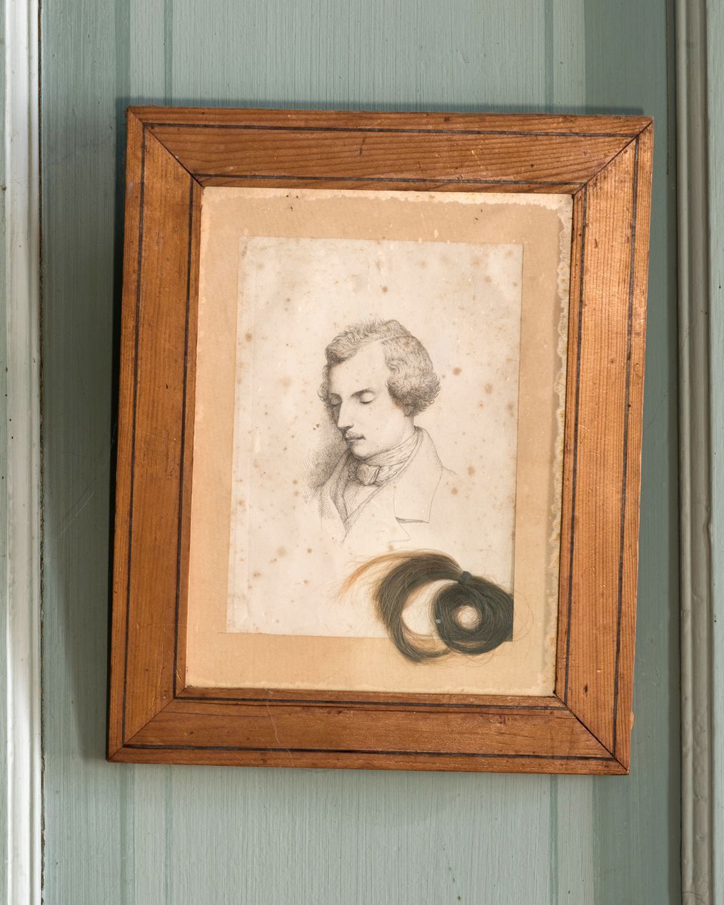 Vue intérieure, détail du portrait d'un défunt avec touffe de cheveuxImmatriculation