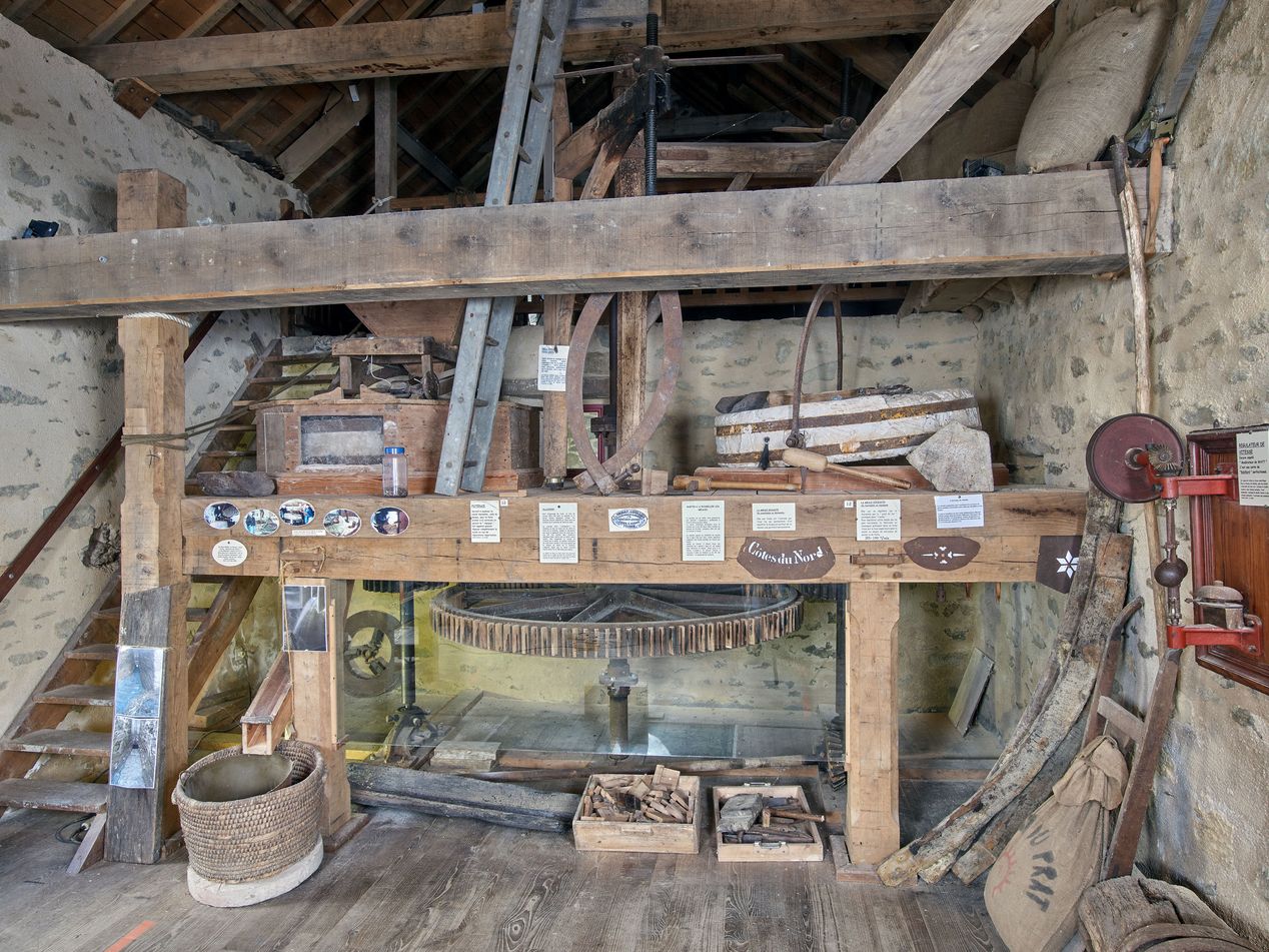 Vue intérieure, écomusée : deux meules exposéesImmatriculation