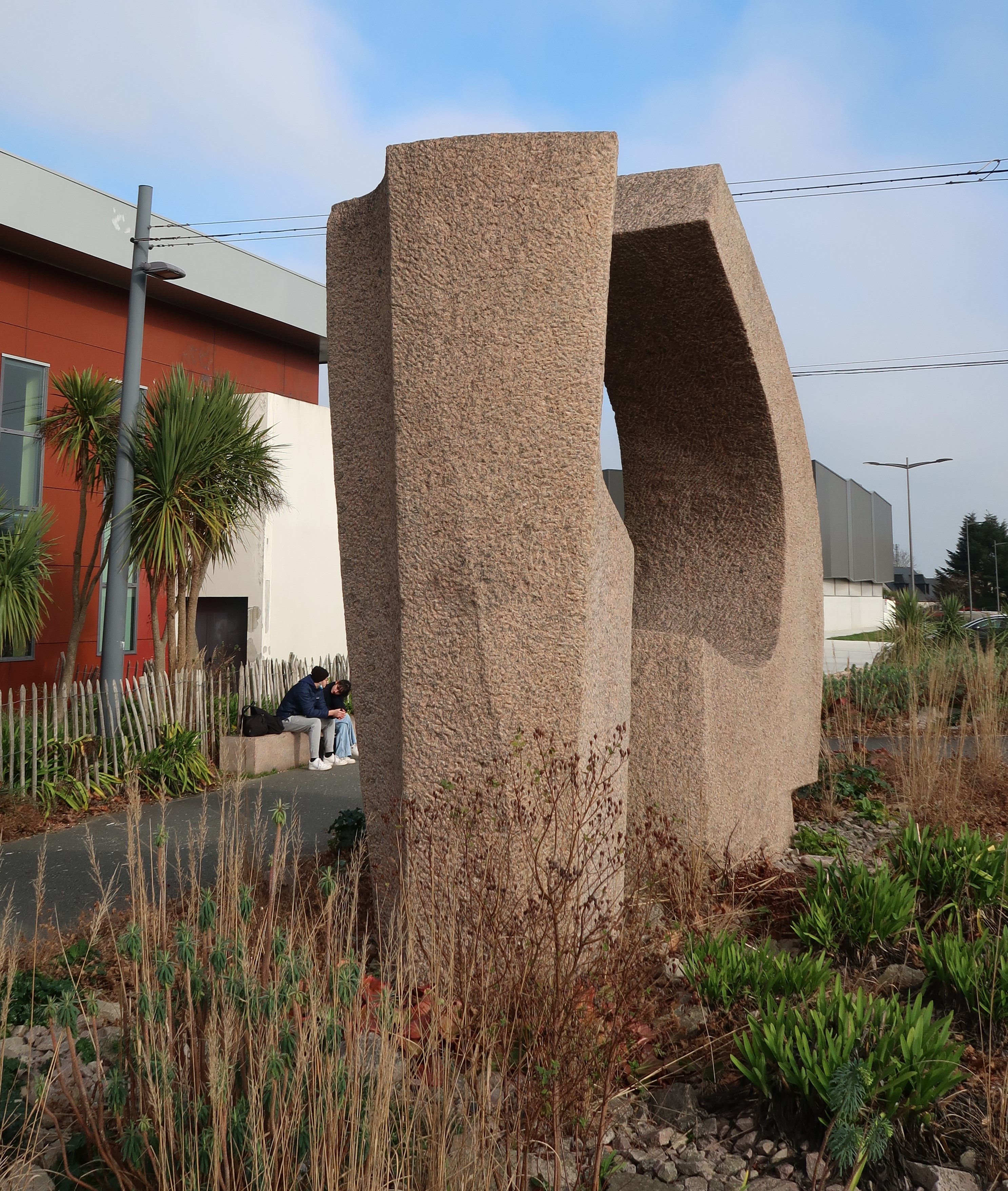 Sculpture en granite rose de Morice Lipsi "Dialogue de la Tangente et de la Verticale" (1972).Immatriculation