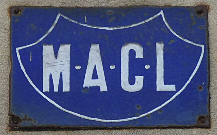 Plaque de tôle émaillée "M.A.C.L" de la rue du Capitaine-Lagache à Paris, acronyme pour "Maison assurée contre l’incendie". Cette plaque est apposée au-dessus de la porte d’entrée et prouve que la cotisation a été payéeImmatriculation