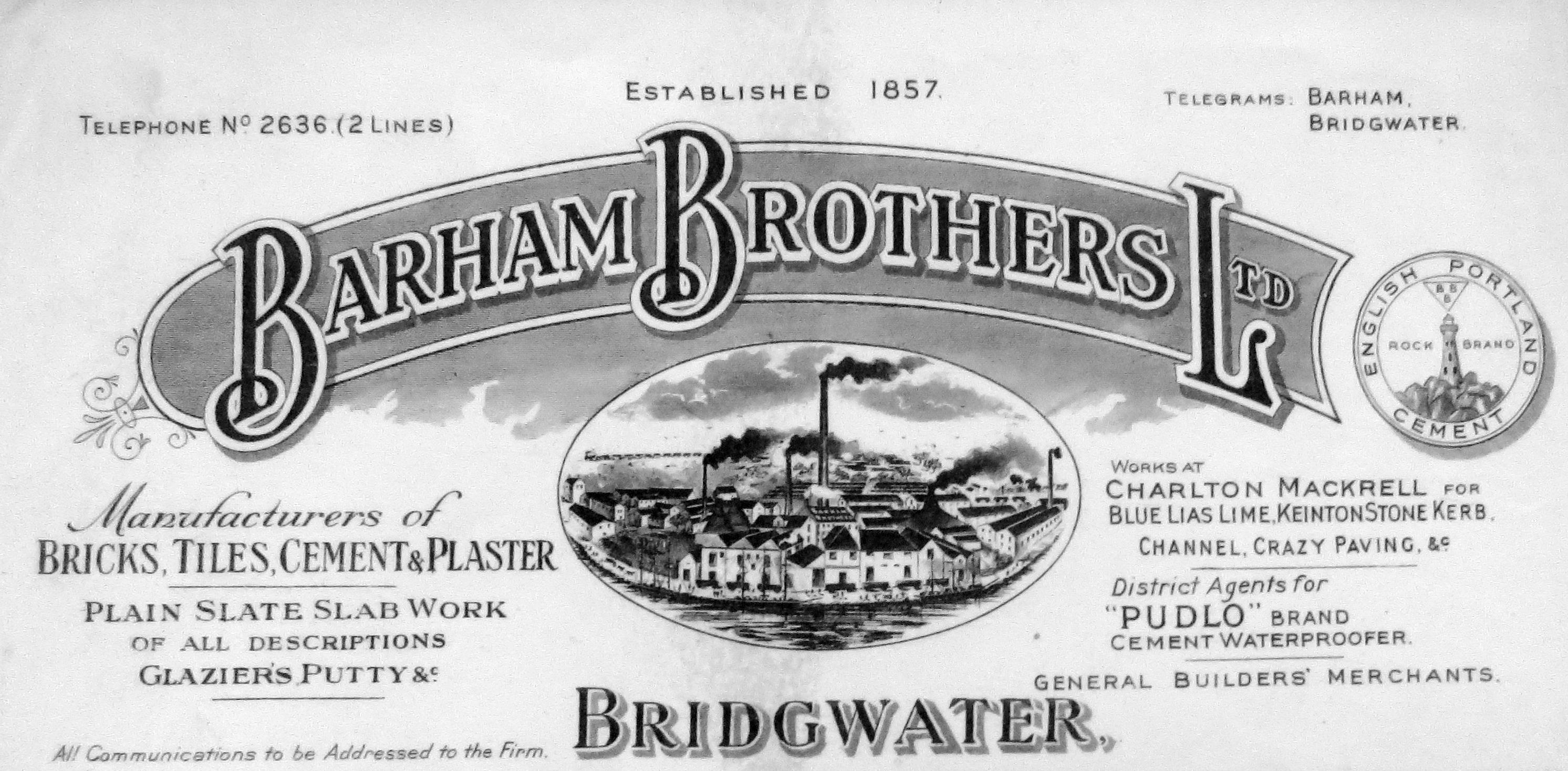 En-tête de lettre conservé par le Somerset Brick & Tile Museum à Bridgwater. En vignette, une vue de Bridgwater dominée par les hautes cheminées des fours. En avant-plan la rivière Parrett sur les bords de laquelle se situaient les bureaux de plusieurs briqueteries, y compris celle de Barham BrosImmatriculation