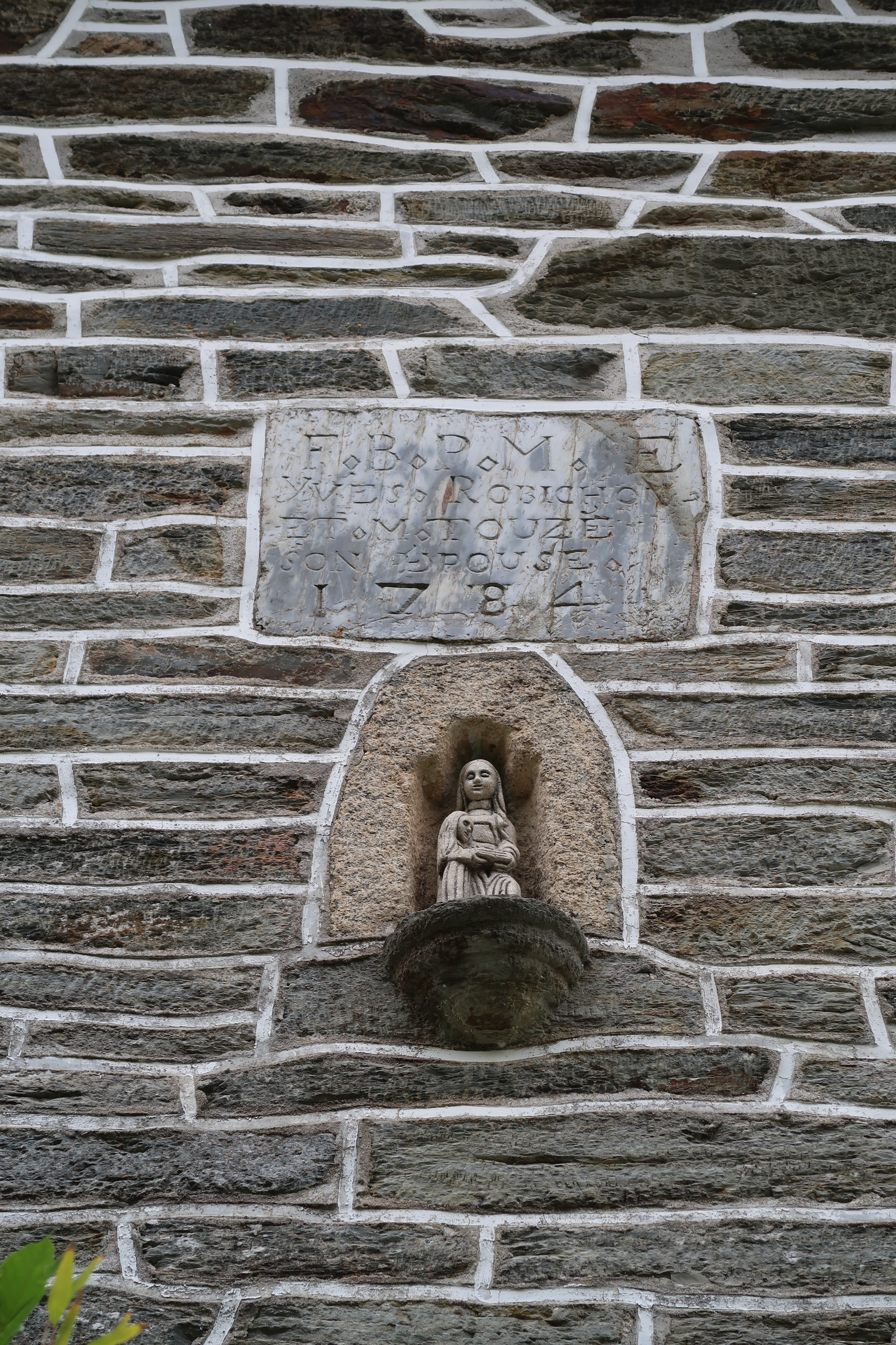 Inscription sur la maison "F. B. P. M. E. YVES ROBICHON ET M. TOUZE SON ÉPOUSE 1784".Immatriculation