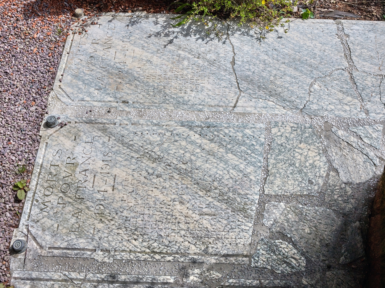 Monument "Aux anciens des lycées de Brest morts pour la patrie. MCMLXIV" : Détail. Au sol vestige des plaques en marbre portant les noms des défunts. Elles proviennent de l'ancien lycée, rue Voltaire, détruit pendant la Seconde Guerre mondiale, et installées provisoirement dans la cour du lycée en baraques.Immatriculation