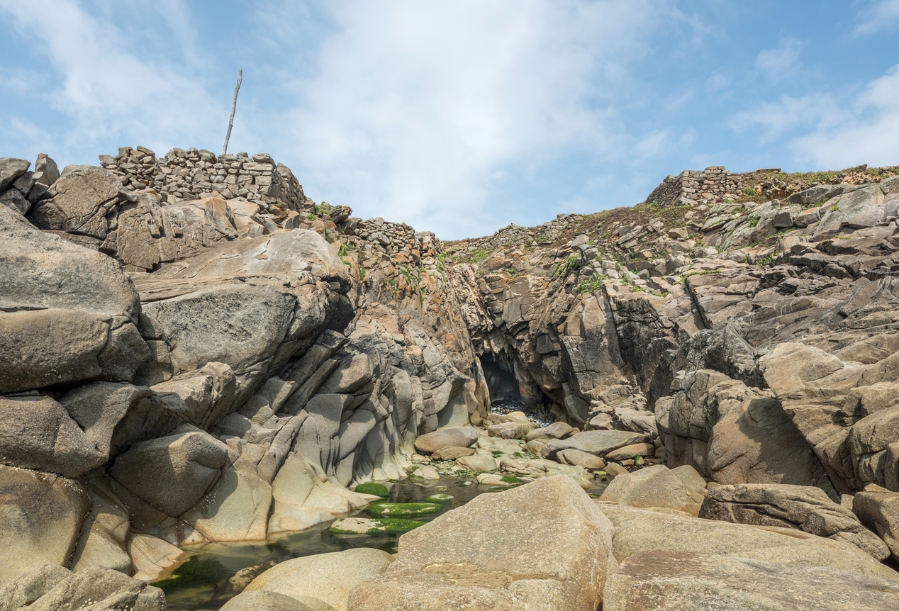 Kougon Bras Brigneoc'h, vue générale sud du site prise de la côte : murs de soutenement, promontoire artificiel et mât de levage. (2022)Immatriculation