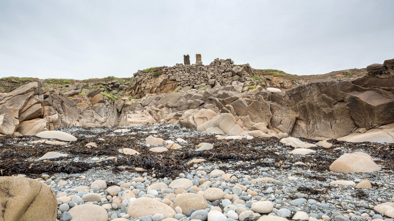 Mur de soutènement en pierre sèche, vue générale sud prise de la grève. Présence de pierres dressées.Immatriculation