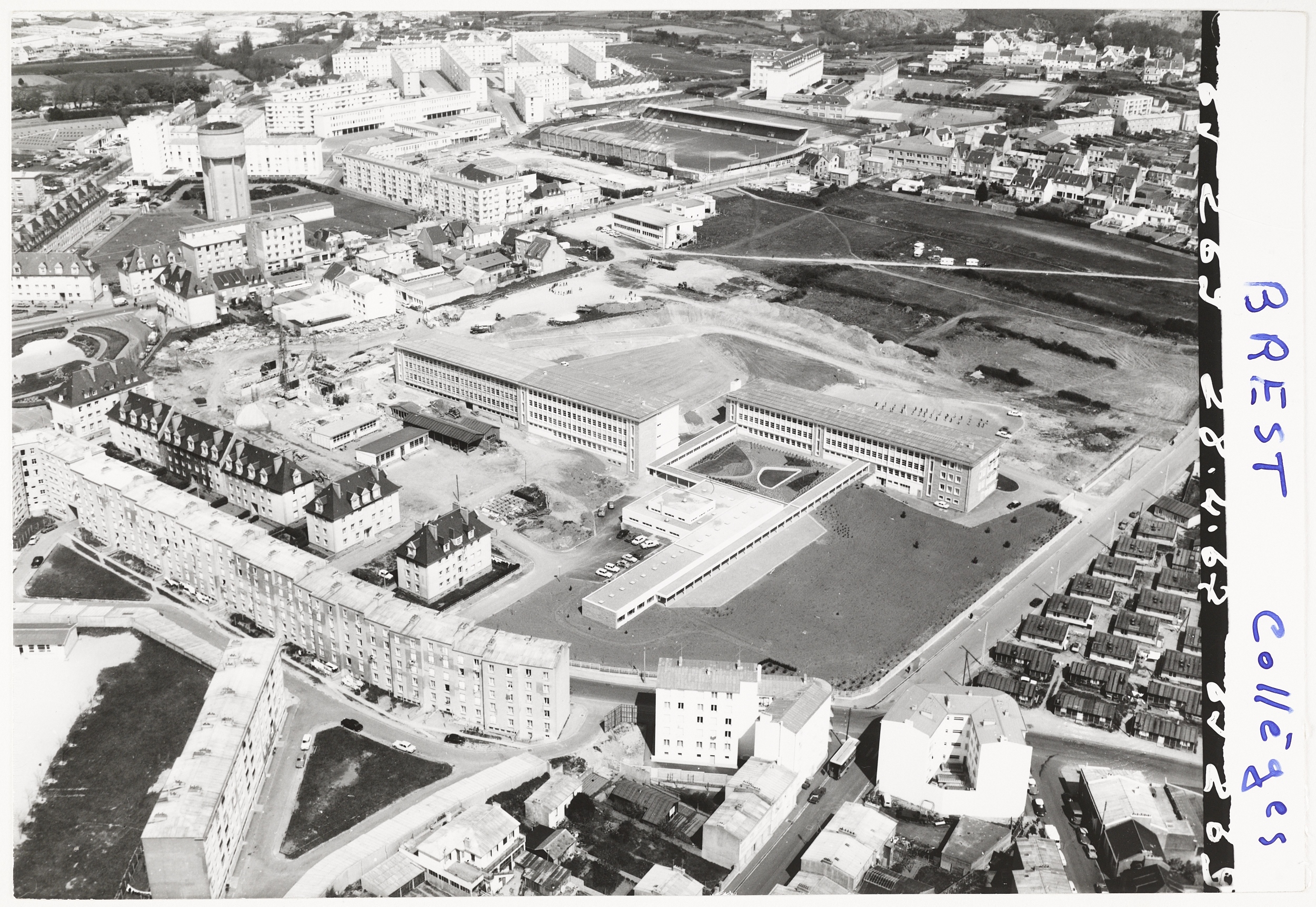 Vue aérienne prise du sud-ouest le 28 avril 1967. La deuxième tranche du bâtiment d'externat du 2e cycle est construite. Les travaux de l'administration débutent, les classes en baraques sont moins nombreuses. Le "patio", entre les externats et la restauration a été réalisé : noter l'importance des galeries de liaison ouvertes, tant en termes de circulation que de définition de l'espace.Immatriculation