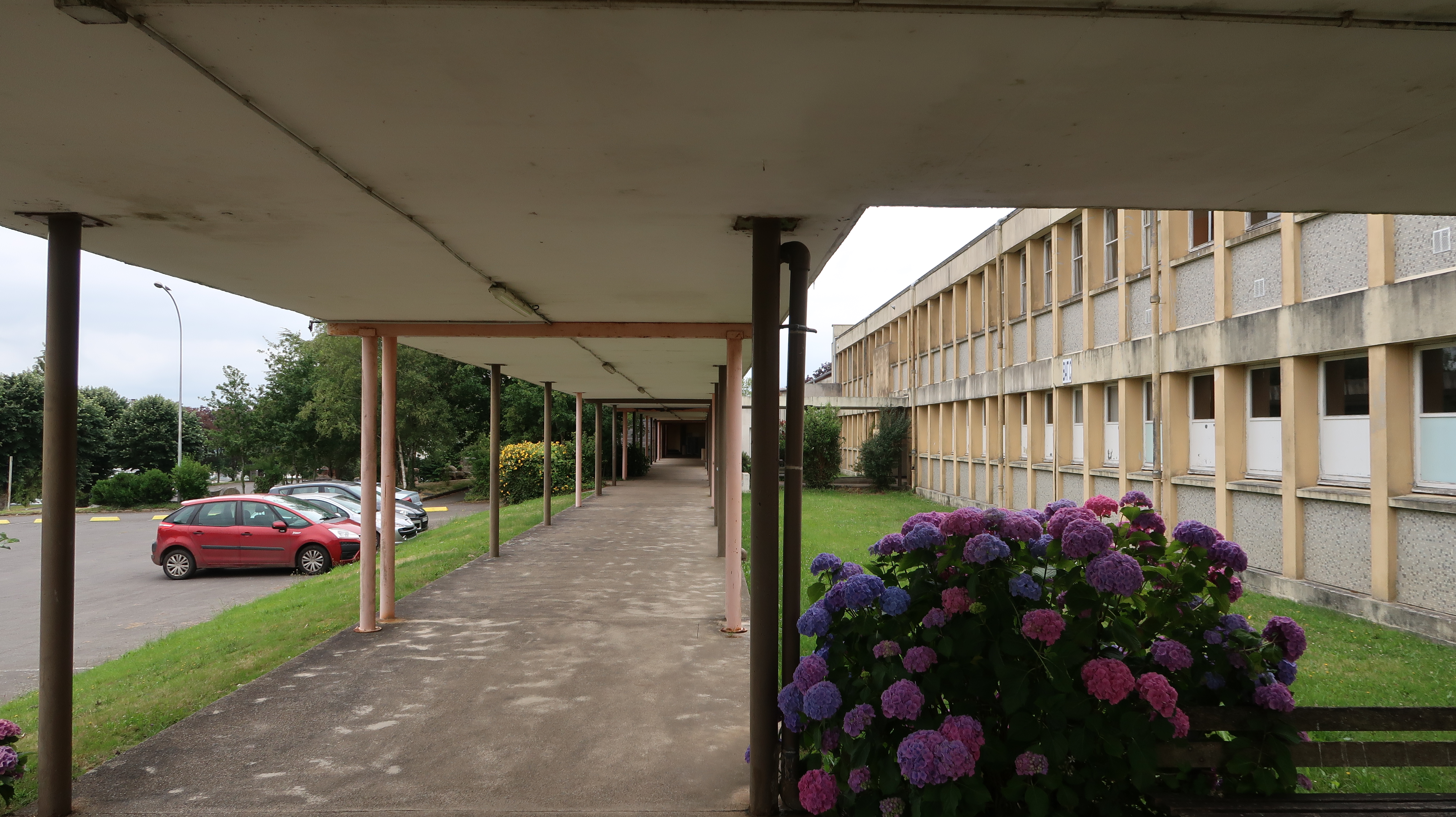 Galerie couverte et façade sud des ateliers. Péron et Weisbein, architectes, 1967-1968.Immatriculation