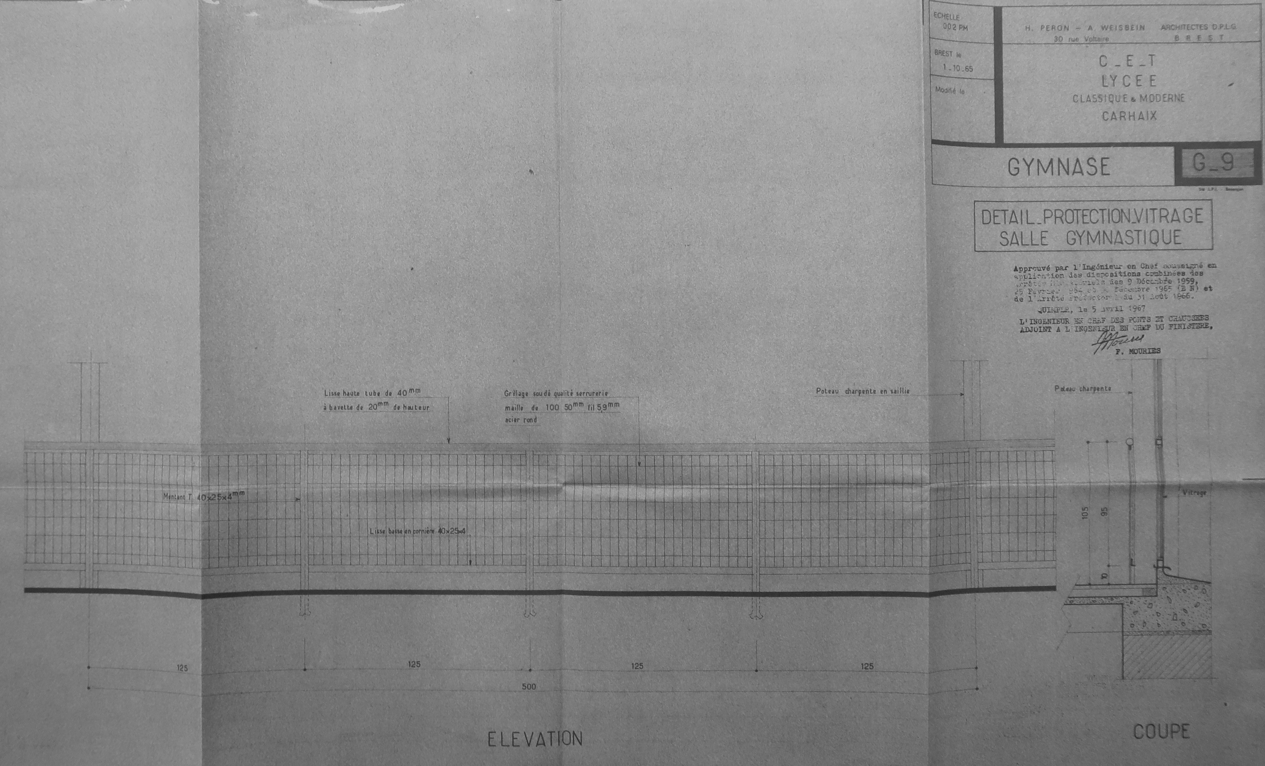 Détail protection vitrage salle de gymnastique. H. Péron et A. Weisbein, architectes, 22/07/1965.Immatriculation