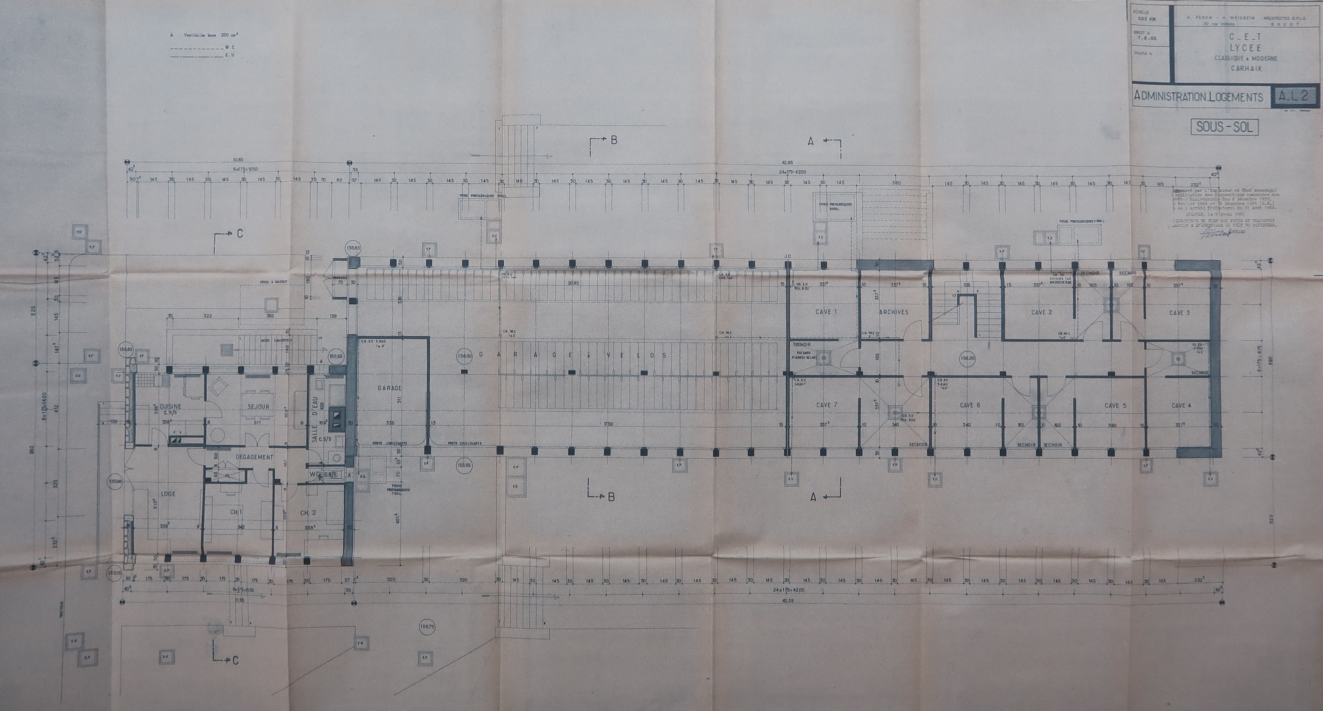 Archives départementales du Finistère : 107W39. Péron [H.] et Weisbein [A.], CET - lycée classique et moderne de Carhaix. Plans de l'administration - logement et du service de restauration, 1965