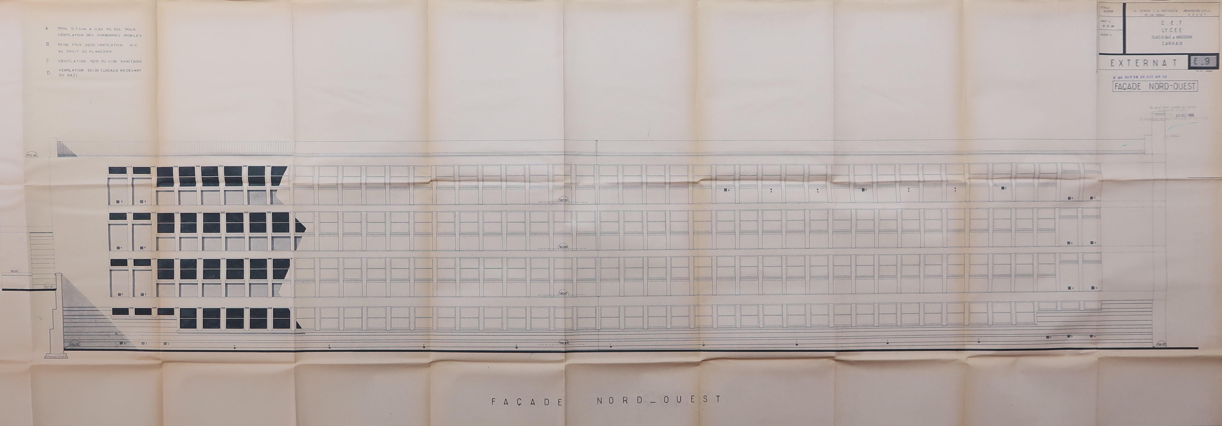 Externat : façade nord-ouest (Hervé Péron et Alexandre Weisbein, architectes, 1964).Immatriculation