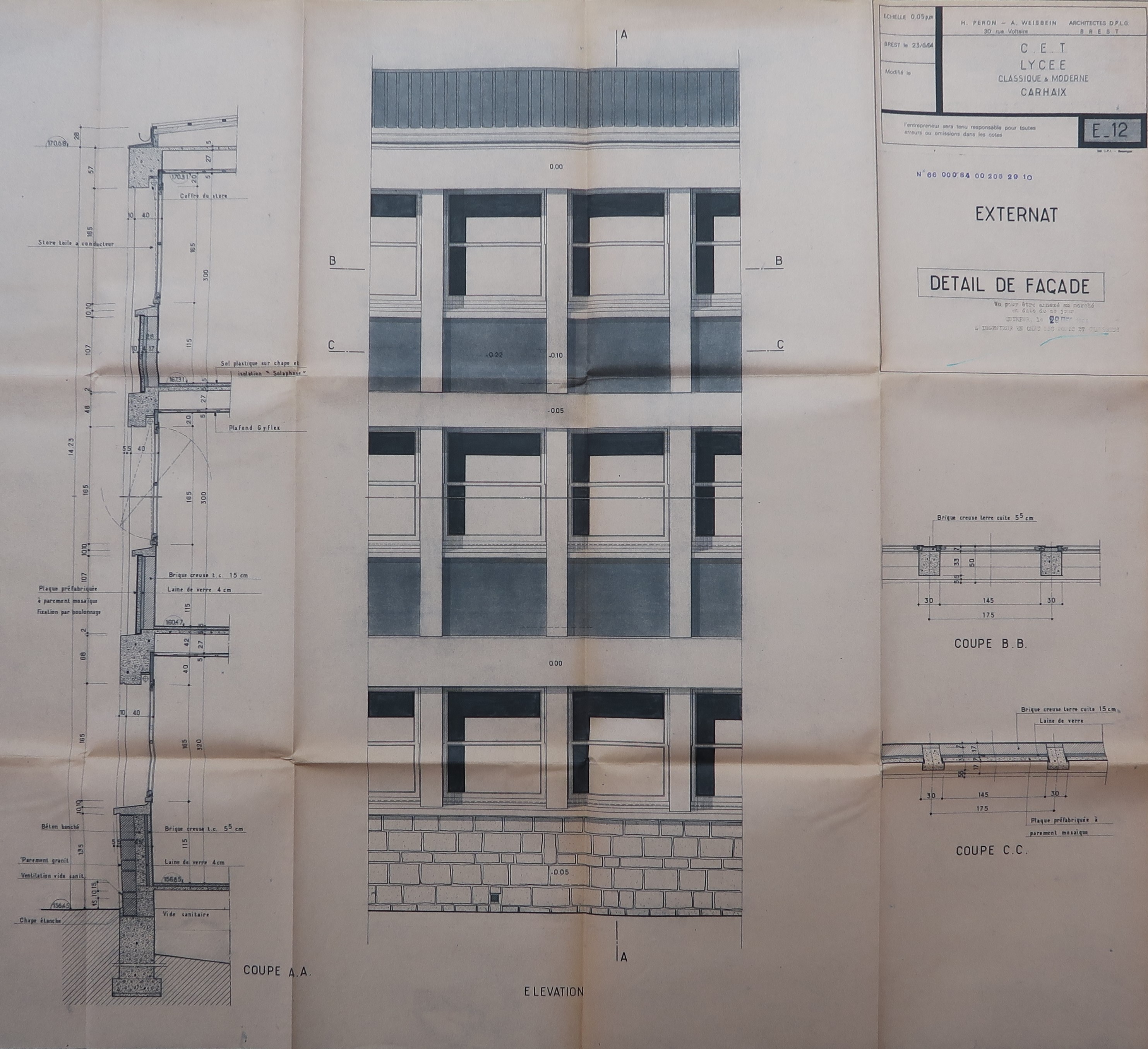 Externat : détail de façade (Hervé Péron et Alexandre Weisbein, architectes, 1964) : pierre en parement au rez-de-chaussée, alternance régulière de la trame, principe de "remplissage" entre deux poteaux (noter la présence d'une fine couche (4 cm) de laine de verre, au niveau des allèges.Immatriculation