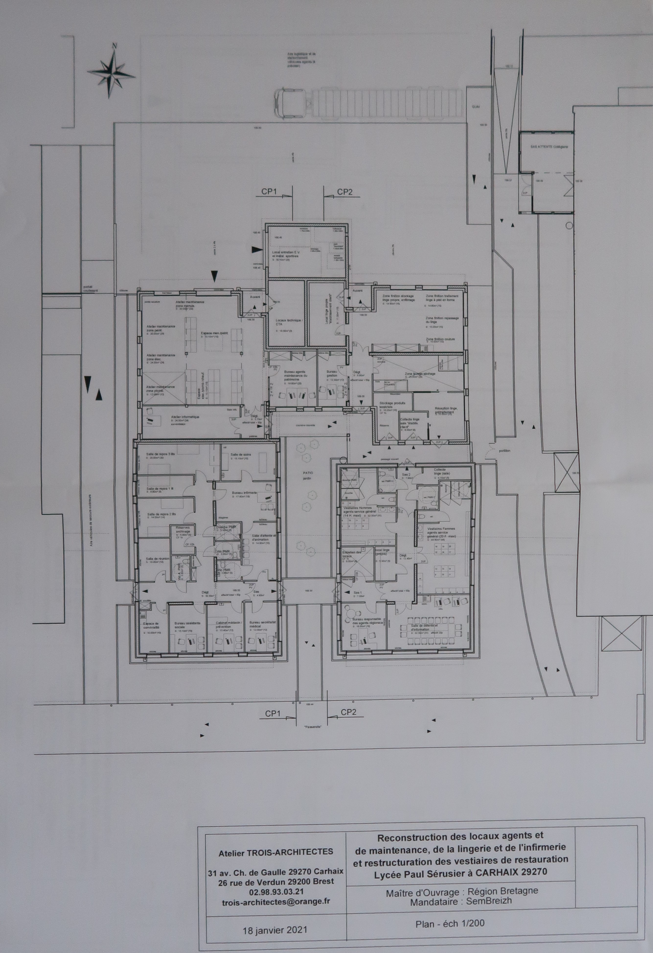 Plan des nouveaux locaux agents, lingerie et infirmerie. A3A, architectes, 2021.Immatriculation