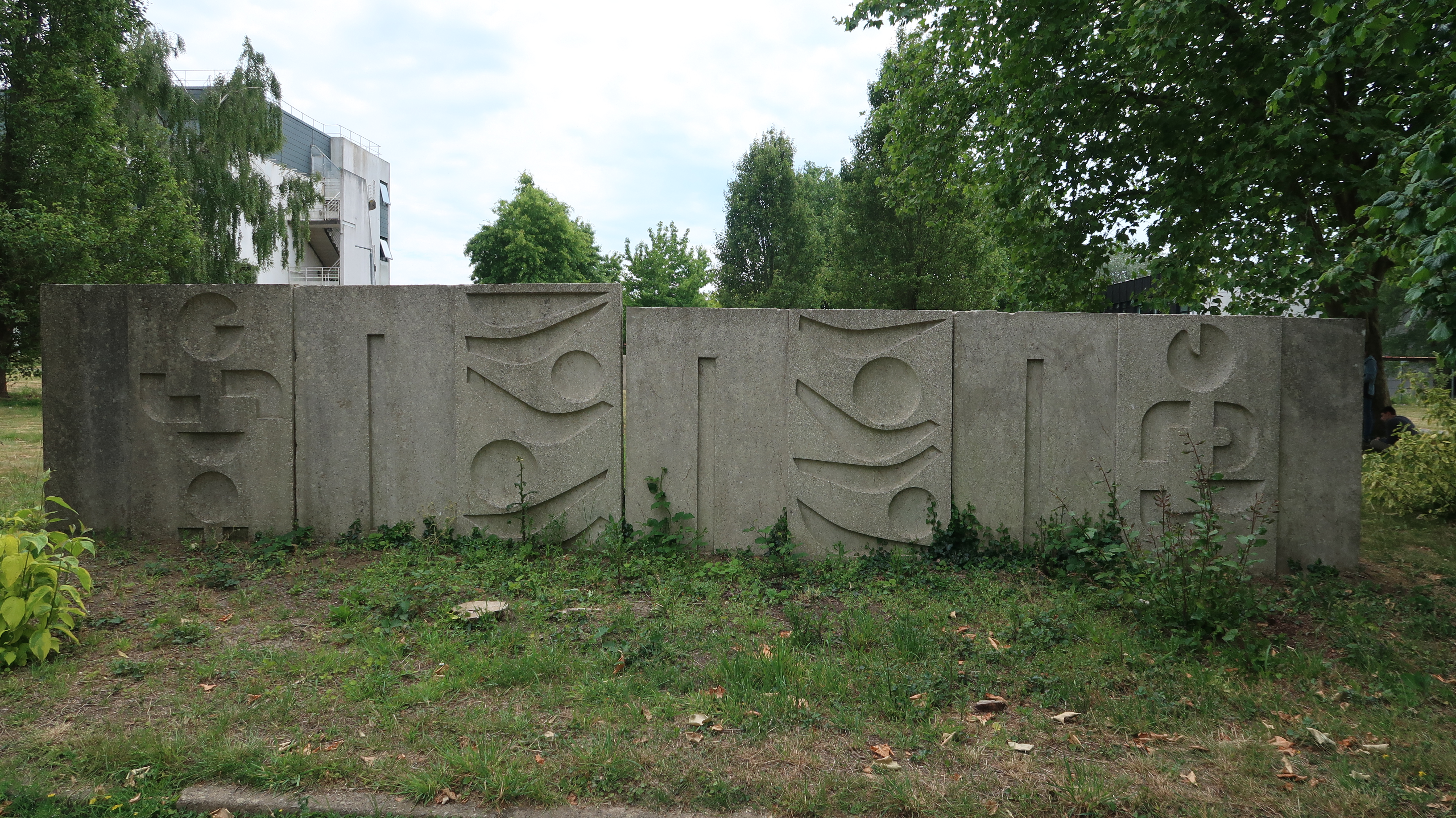 Vue de face du mur sculpté continu (Edgard Pillet, 1970).Immatriculation