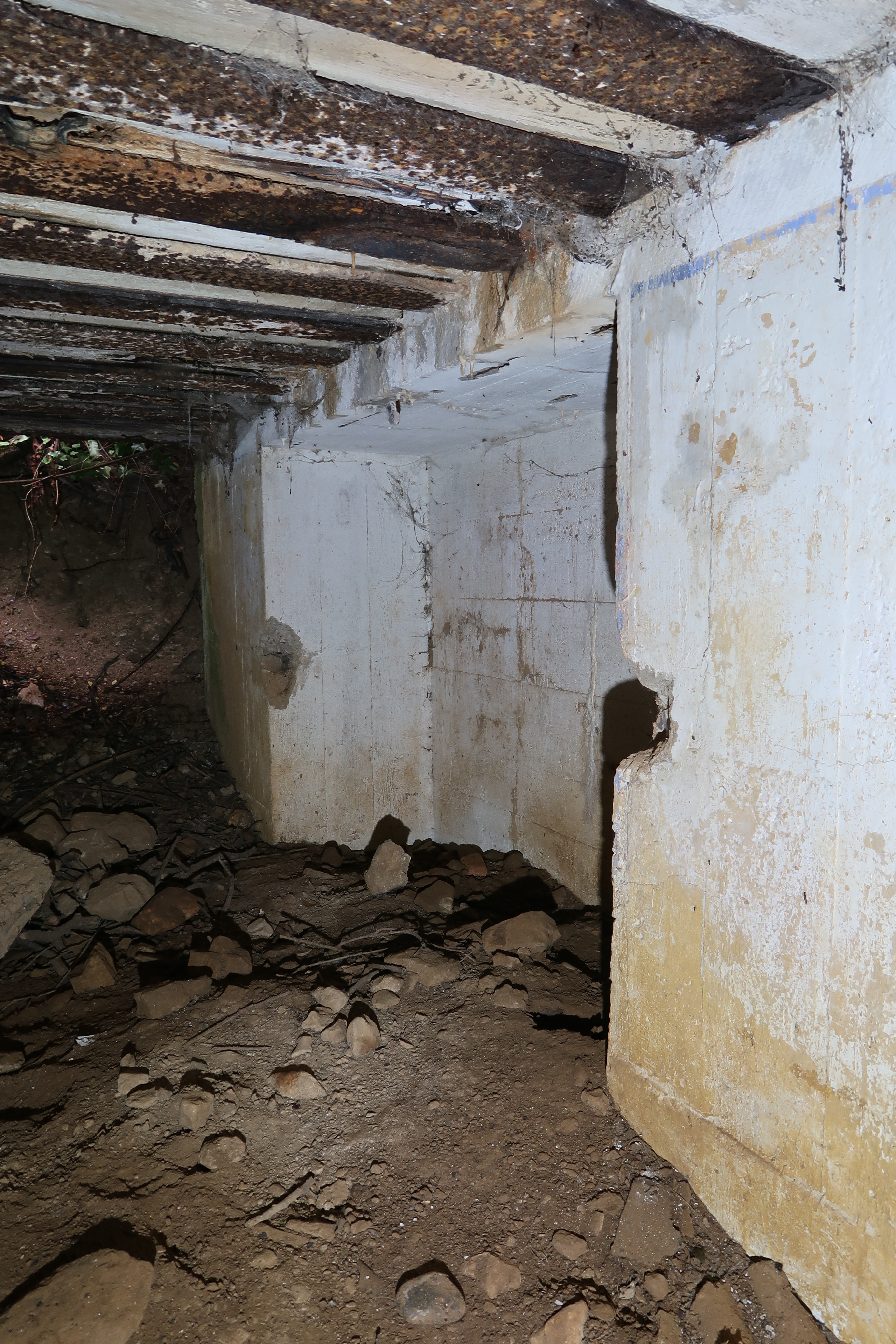 Vue de l'entrée est en partie remblayée et envahie par la végétation (état en 2021). A droite, niche murale (un liseré de couleur bleue est visible sur le mur)Immatriculation