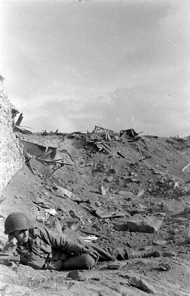 Vue du Fort de Keranroux après les combats du 13 septembre 1944 : soldat américain se reposant, photographie de David E. Scherman pour Life Magazine (Google Arts et Culture)Immatriculation