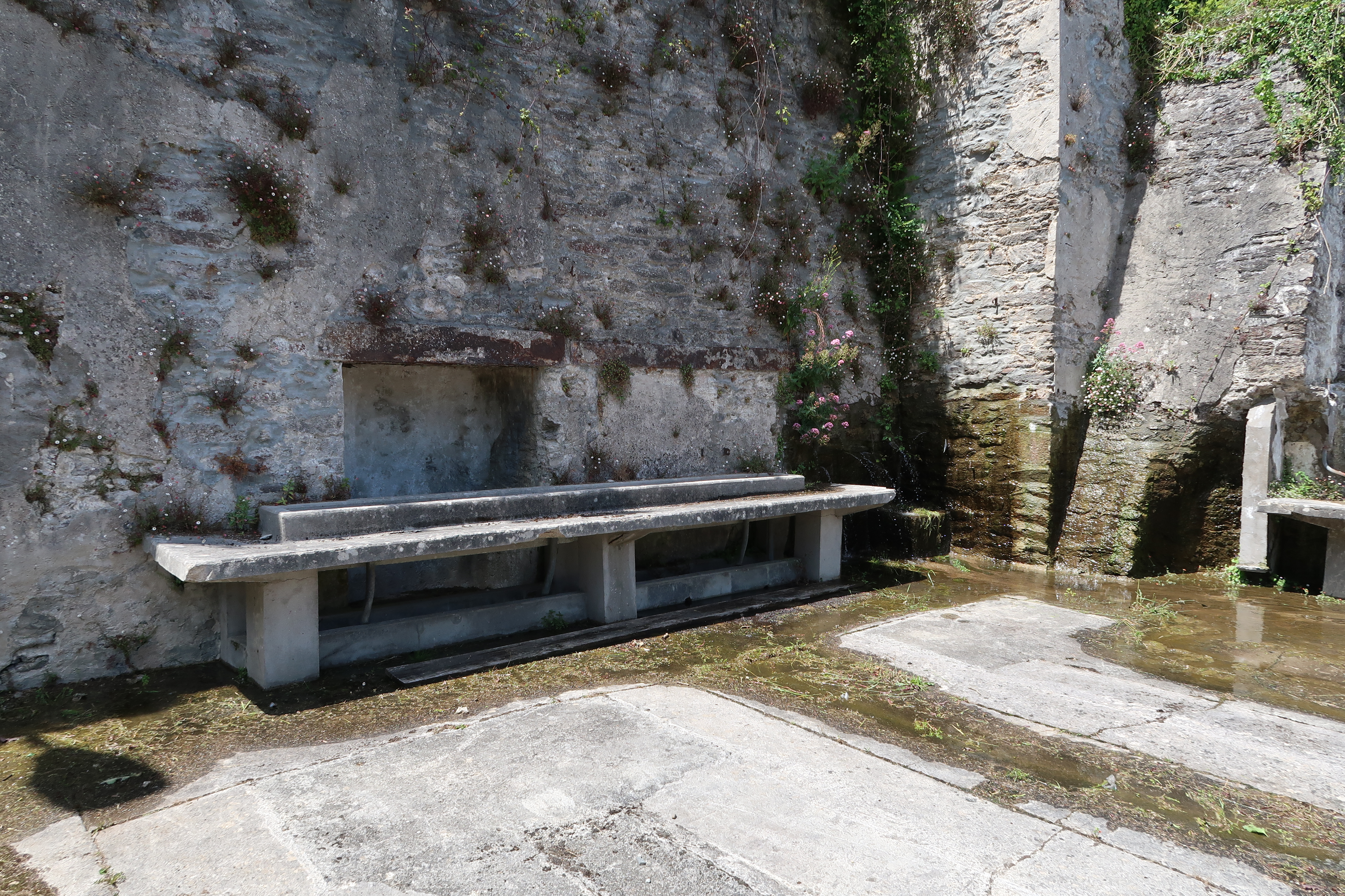 Vue de l'un des deux lavabos collectifs en béton armé (état en 2022). Il est disposé parallèlement à la digue de l'étangImmatriculation