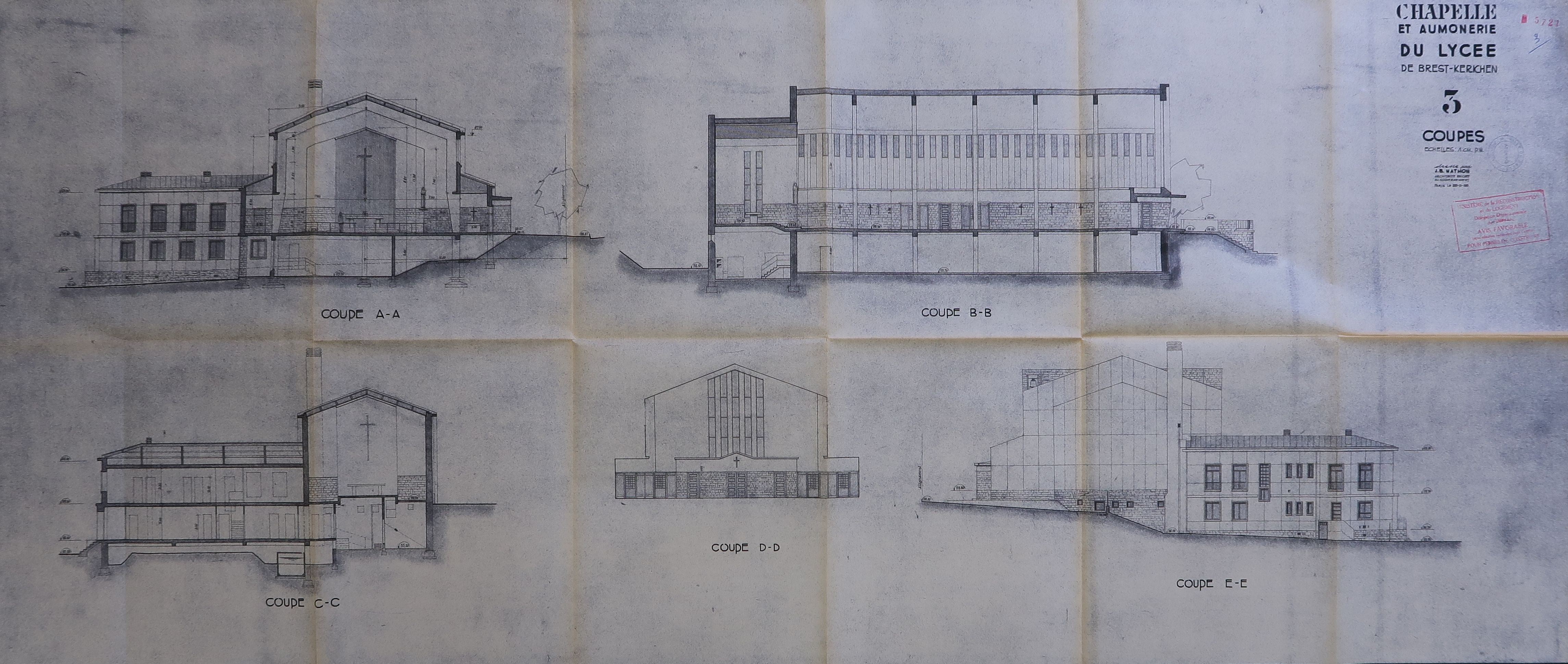 Chapelle et aumônerie du lycée. Coupes. Jean-Baptiste Mathon, architecte, 28.5.58.Immatriculation